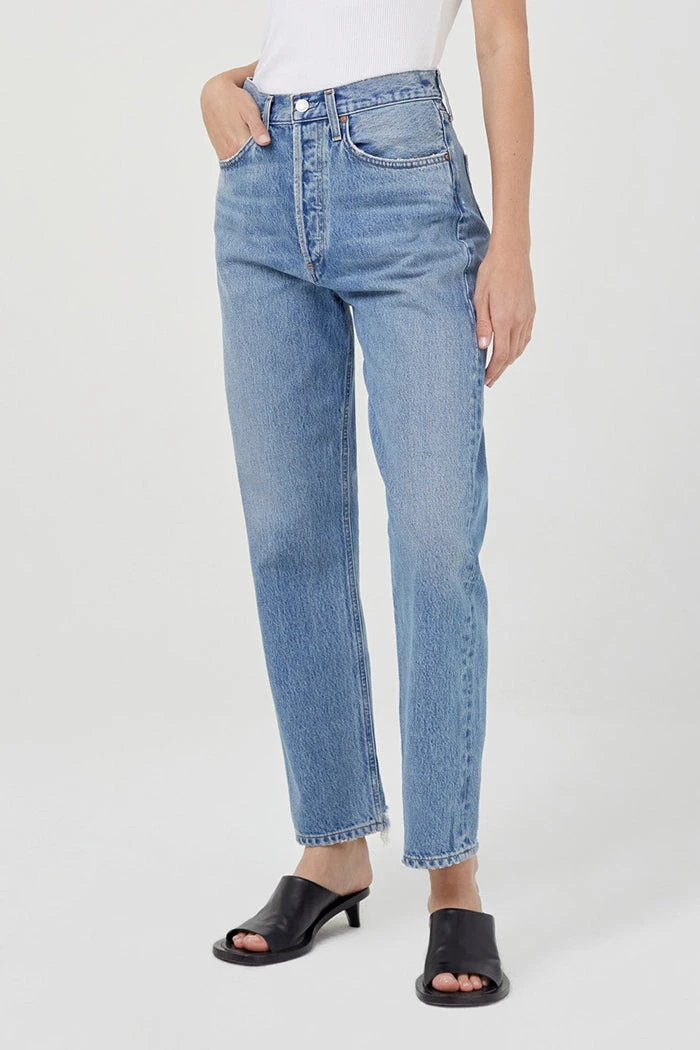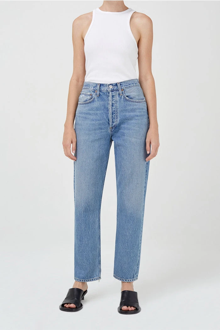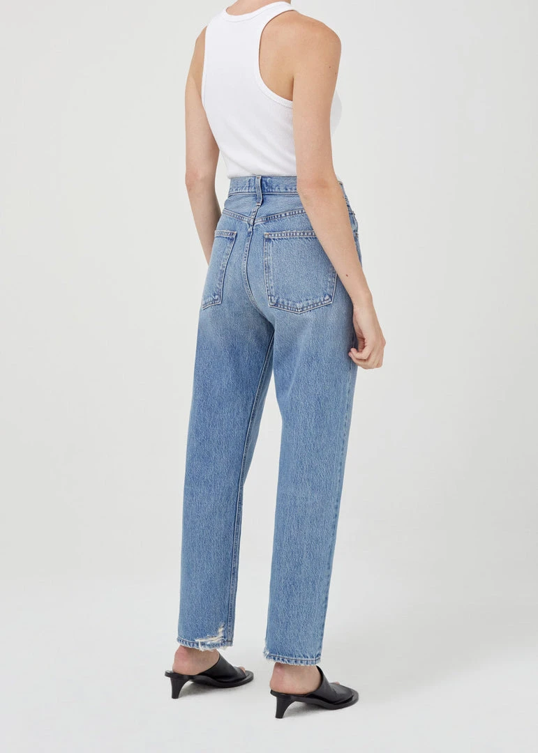 Agolde 90’s jeans in medium indigo blue scheme wash. This 90’s inspired mid-rise is designed to sit relaxed on the waist with an eased up fit through the body. Button fly.