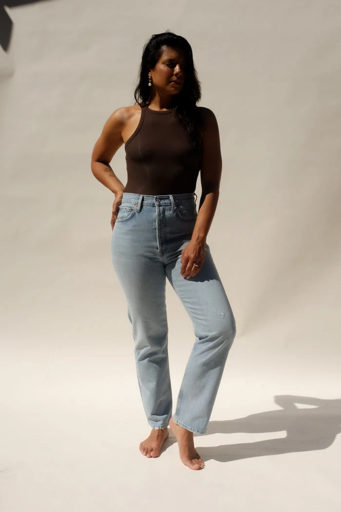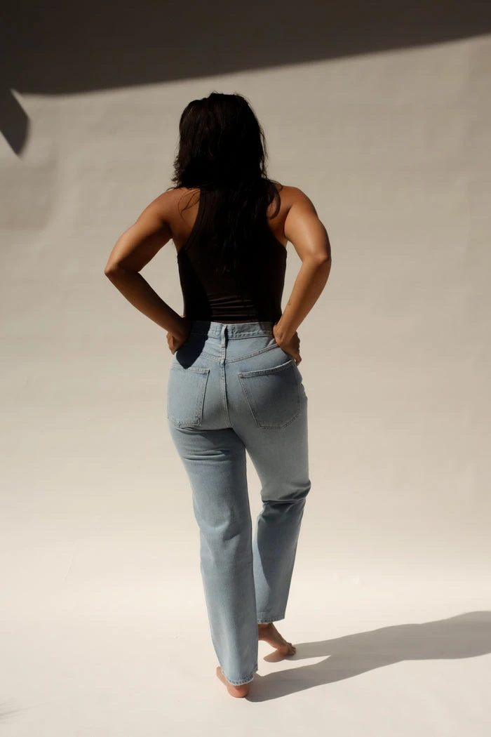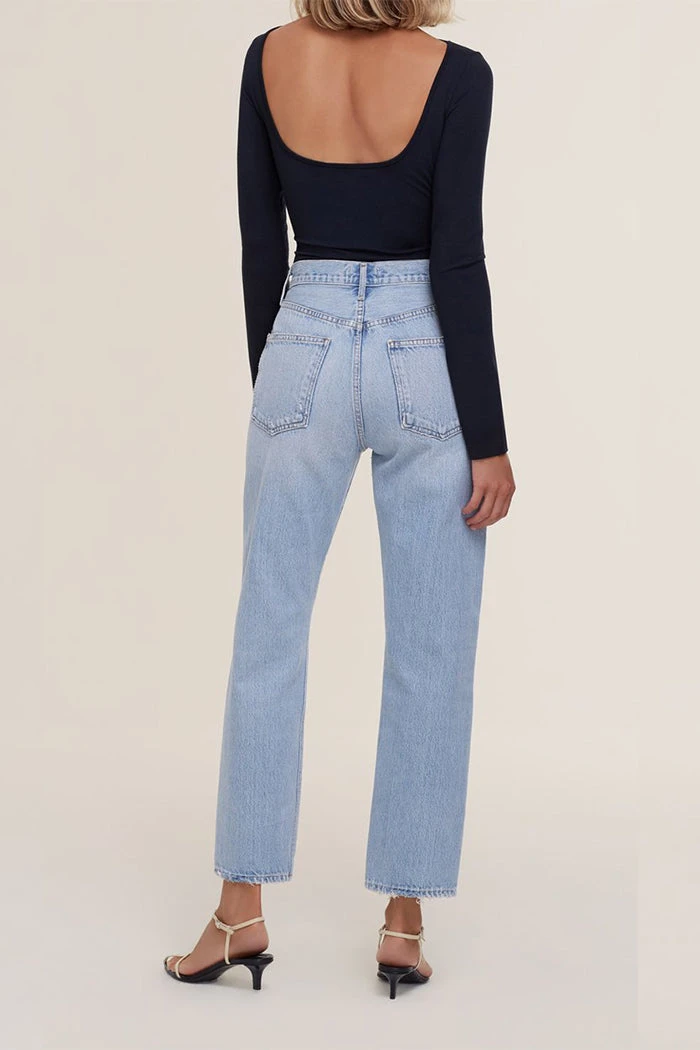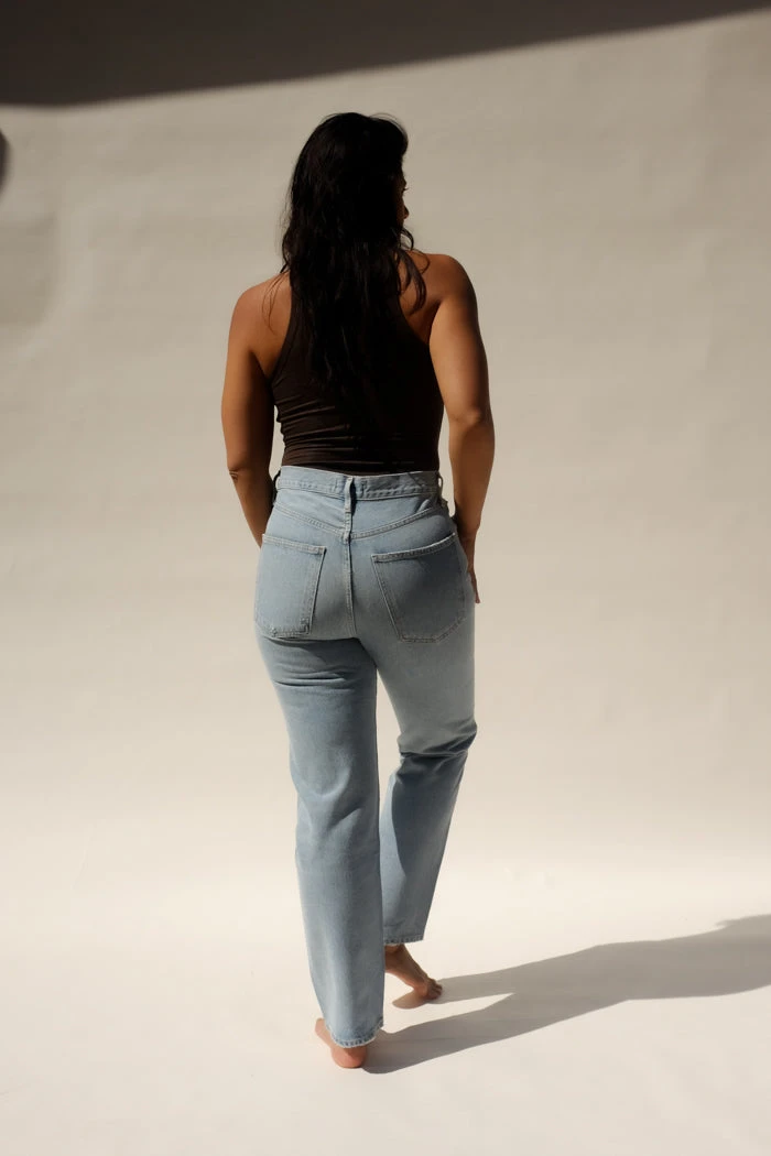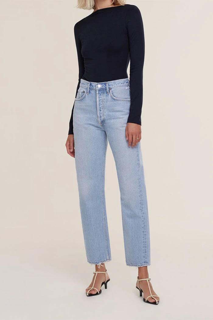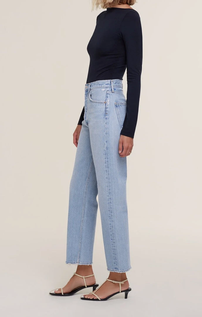 Agolde 90’s jeans in clean powdery blue semi tropic wash. This 90’s inspired mid-rise is designed to sit relaxed on the waist with an eased up, straight fit through the body. Wear them with just about anything, from classic tees to chunky knits. Button fly. Non stretch denim with an authentic feel, washed down for a soft to the touch feel.Â