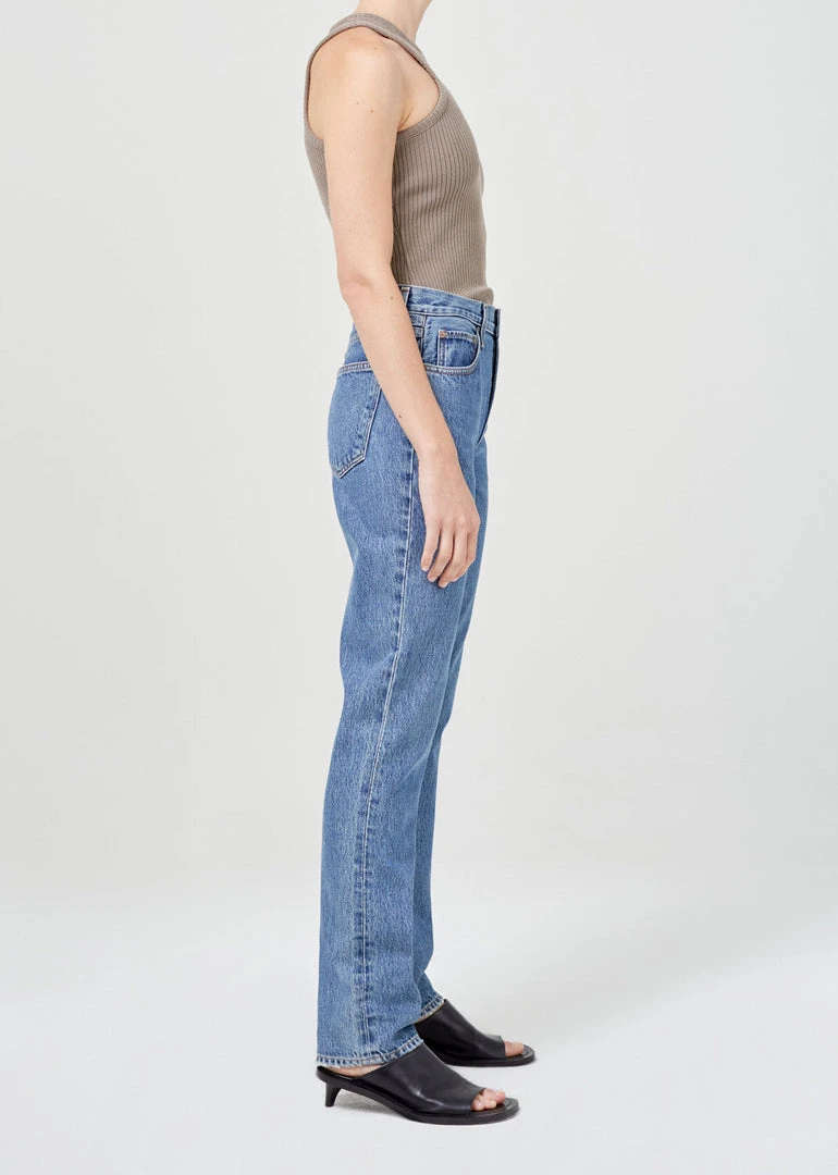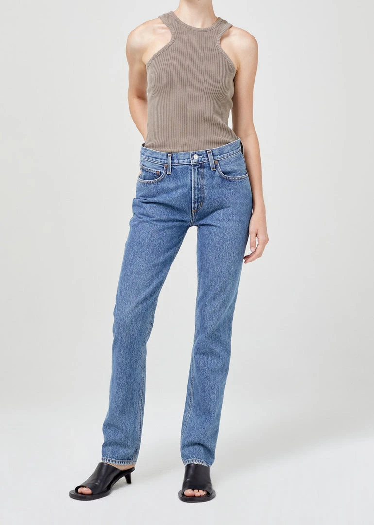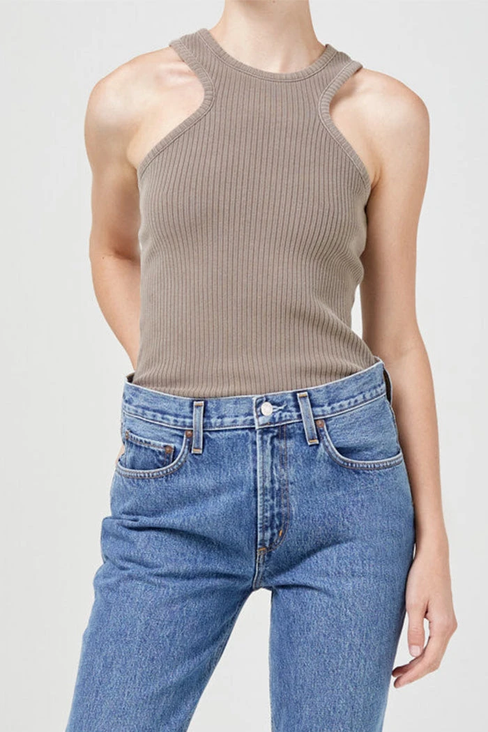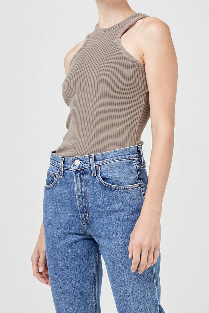 Agolde Bea cutaway ribbed tank top in biscotti tan. Crafted from Agolde’s signature rib, the Bea tank features a distinctive neckline and fit that flatteringly hugs your frame. Midweight chunky rib.Â