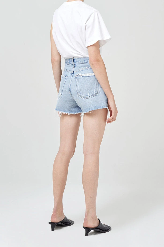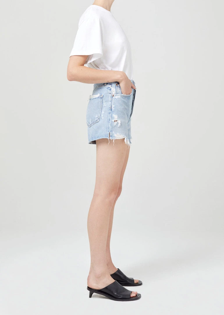 Agolde Dee super high rise cut off short in light blue muse wash. Ultra high rise short with a closer fit around the thigh crafted from rigid pure cotton. Non-Stretch. Button fly closure.