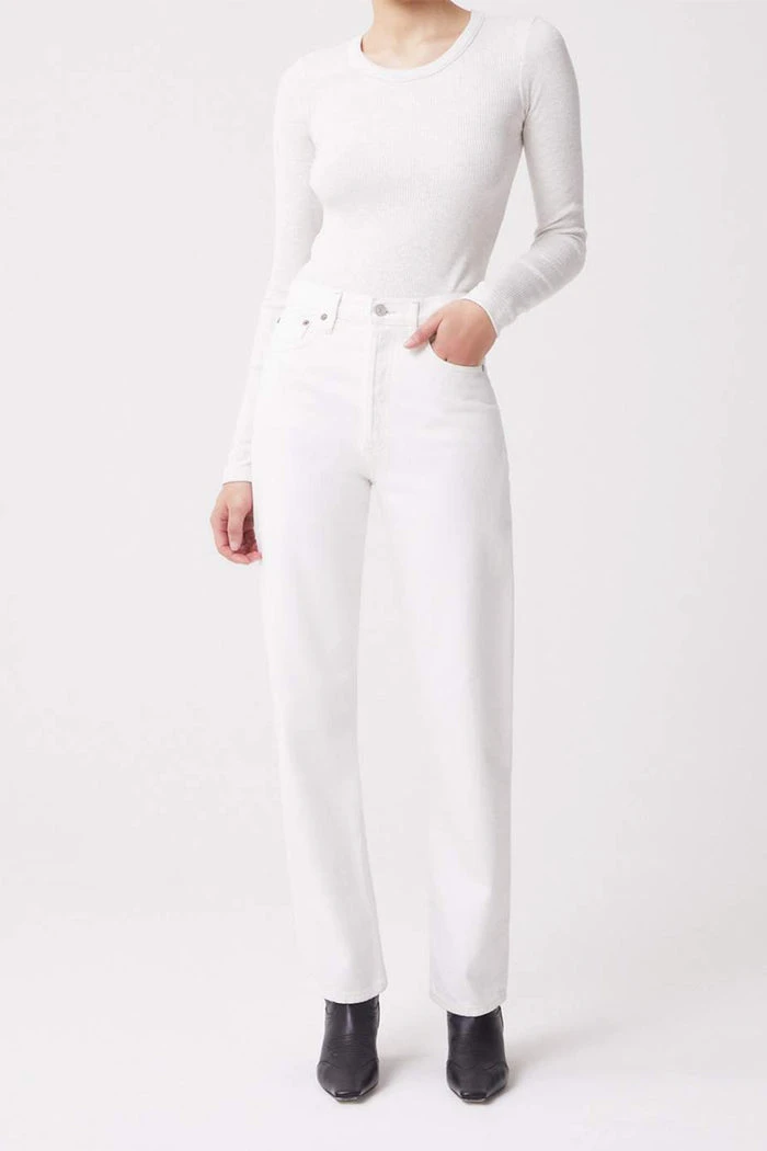 Agolde Maya long sleeve rib tee in brushed oatmeal heather. Crafted from a ultra-soft heathered rib, the Maya Long sleeve is cut with a scoop neckline and fit that flatteringly hugs your frame.