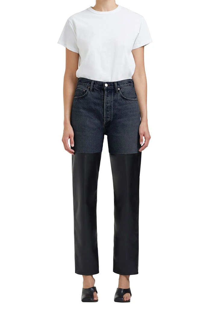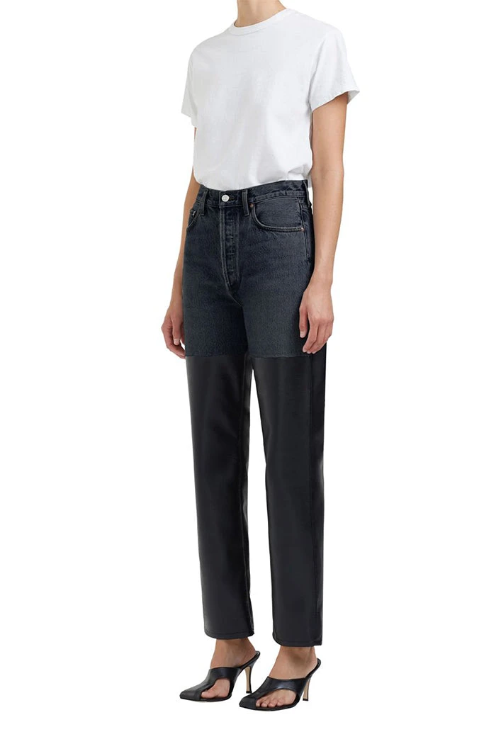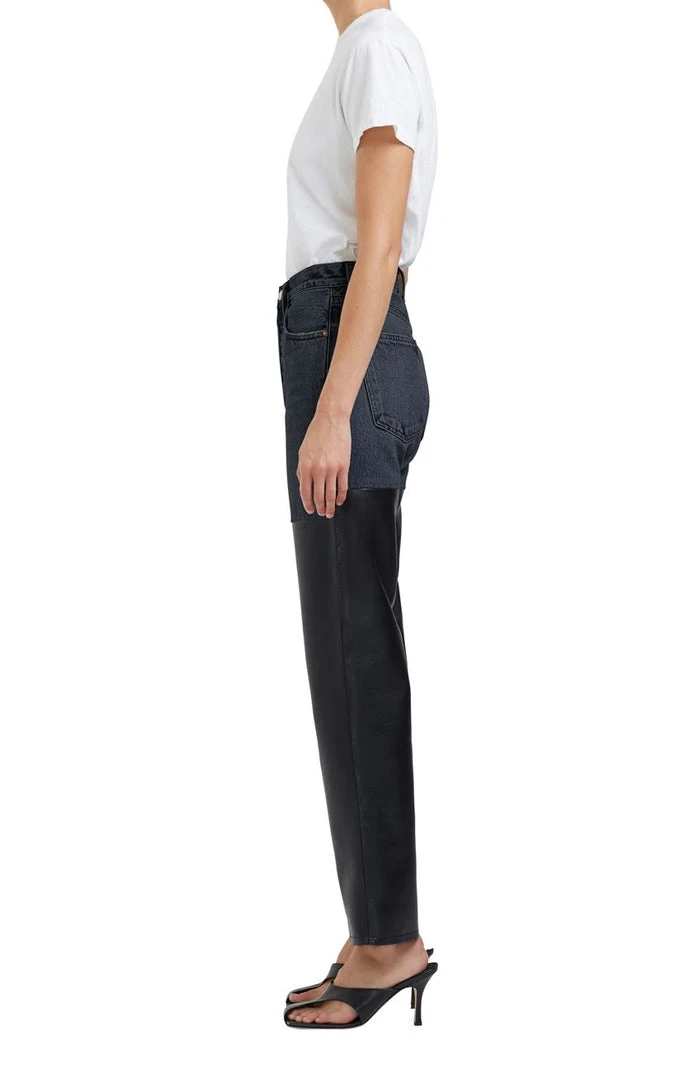 Agolde pieced 90’s pinch waist jeans, in Howl washed black denim and Detox black recycled leather. This leather and denim vintage-inspired straight sits neat at the true waist with a close-fitting top, finished with an easy leg. Non-stretch, soft denim/buttery soft luxe leather.