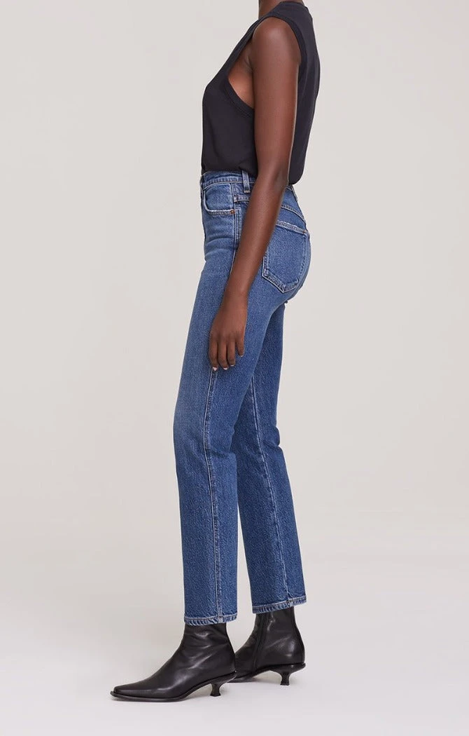 Agolde pinch high rise kick in medium indigo Sound wash, with subtle fading and whiskering. Aptly named, this 80s-inspired silhouette is designed to flatter your frame with a neatly cinched waistband. The crowd favorite features a higher-than-high rise, slim fit through the thighs and cropped flared hems. Crafted from stretch denim in a wear-everyday medium indigo wash. Ultra high rise slight kick flare. Zip fly closure.