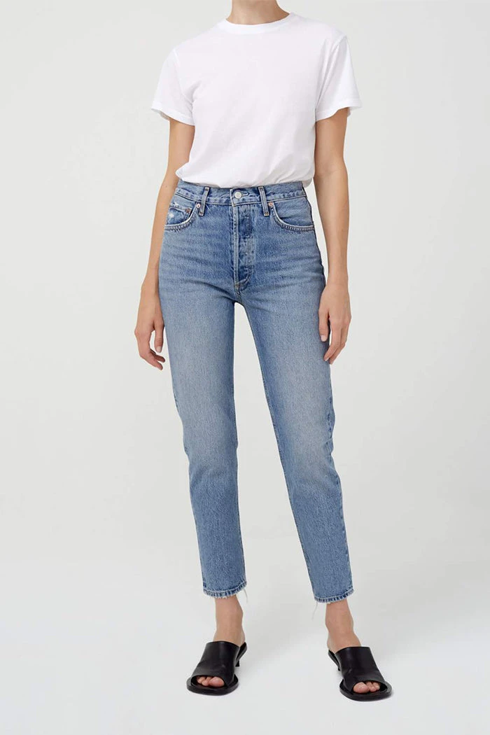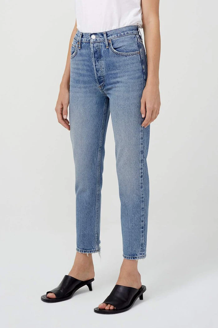 Riley hi rise, straight crop in endless blue by Agolde. The perfect medium light blue clean wash with the perfect hi rise, and straight leg. Slight distressing at back hem. Button fly.