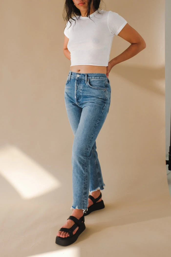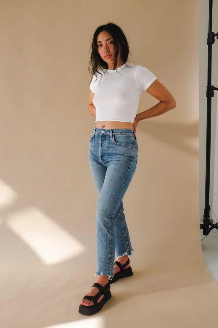 Agolde Riley high rise crop in medium indigo Haven wash. With a better-than-vintage aesthetic, the Riley is an iconic brand favorite. The flattering high-rise and straight leg hold close to the body for a universally loved look. Button fly and raw hem.