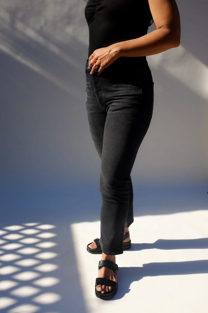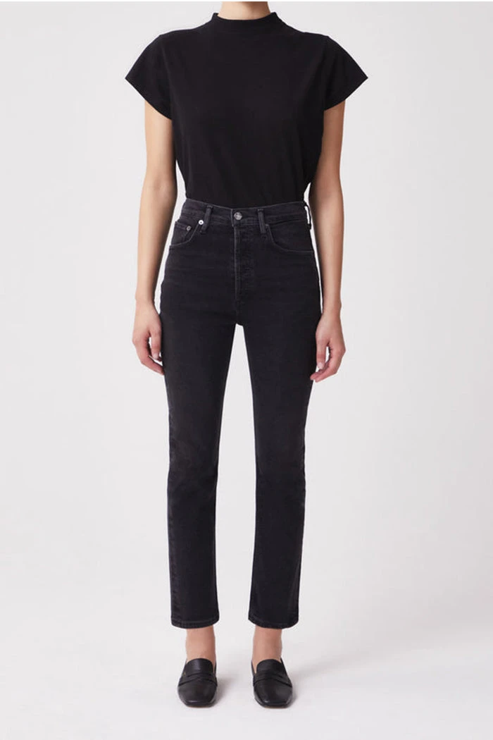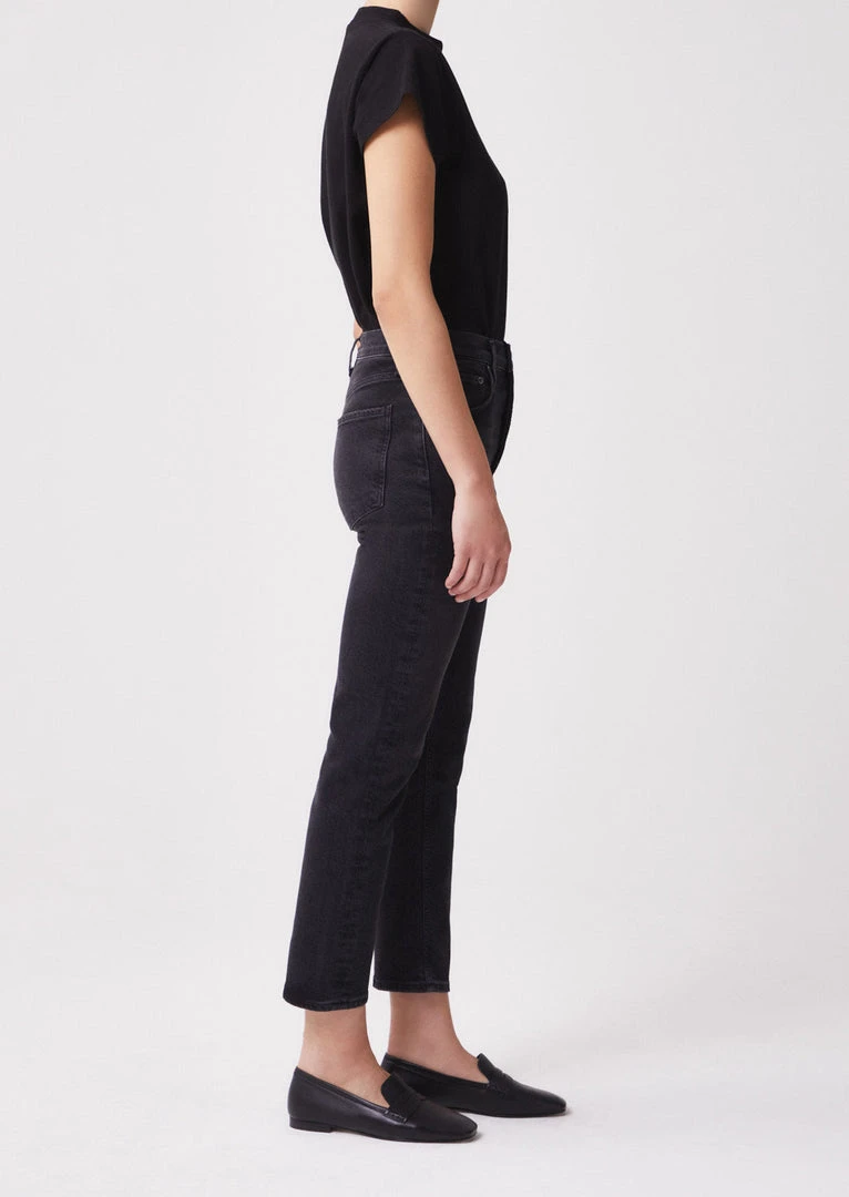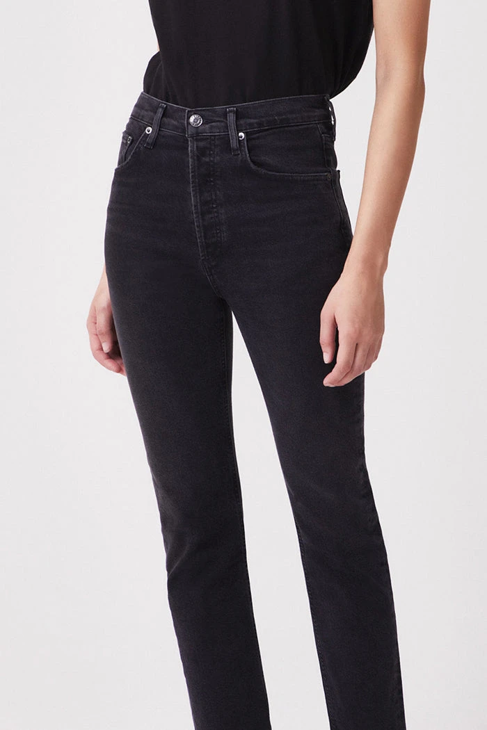 Agolde Riley high waist, comfort stretch washed black Panoramic straight leg jeans. High rise, slim straight leg, sits close to the body with a cropped inseam. Comfort stretch. Button fly closure.