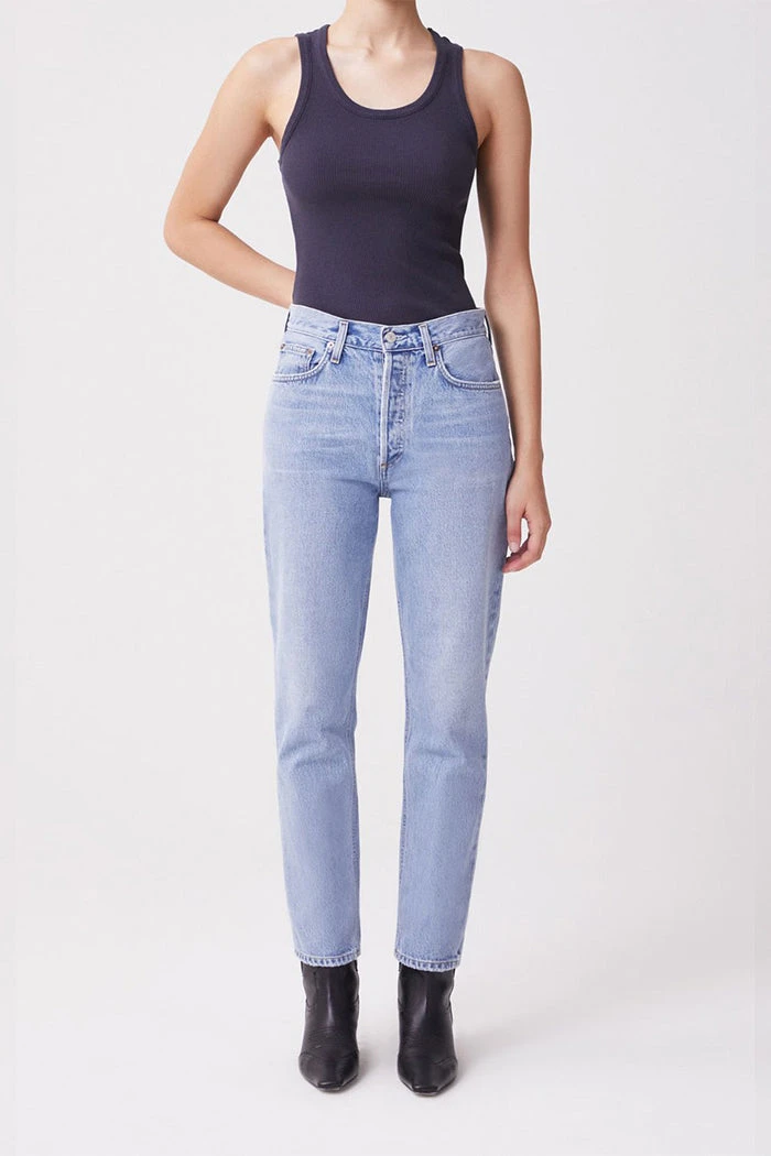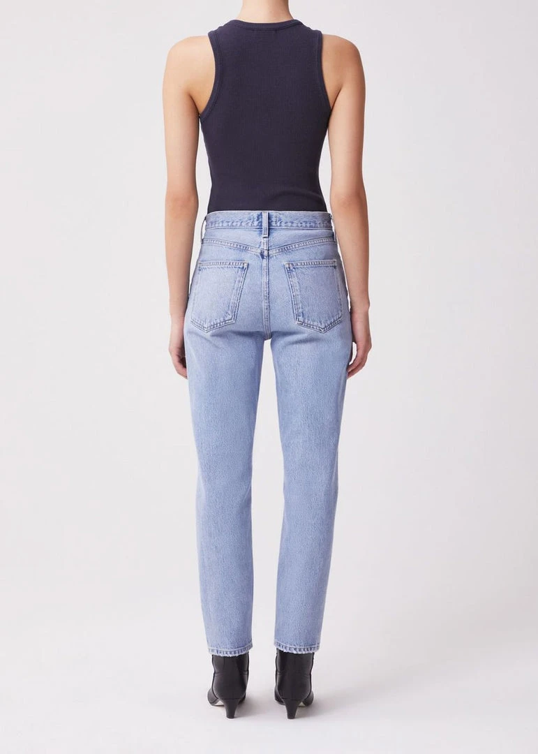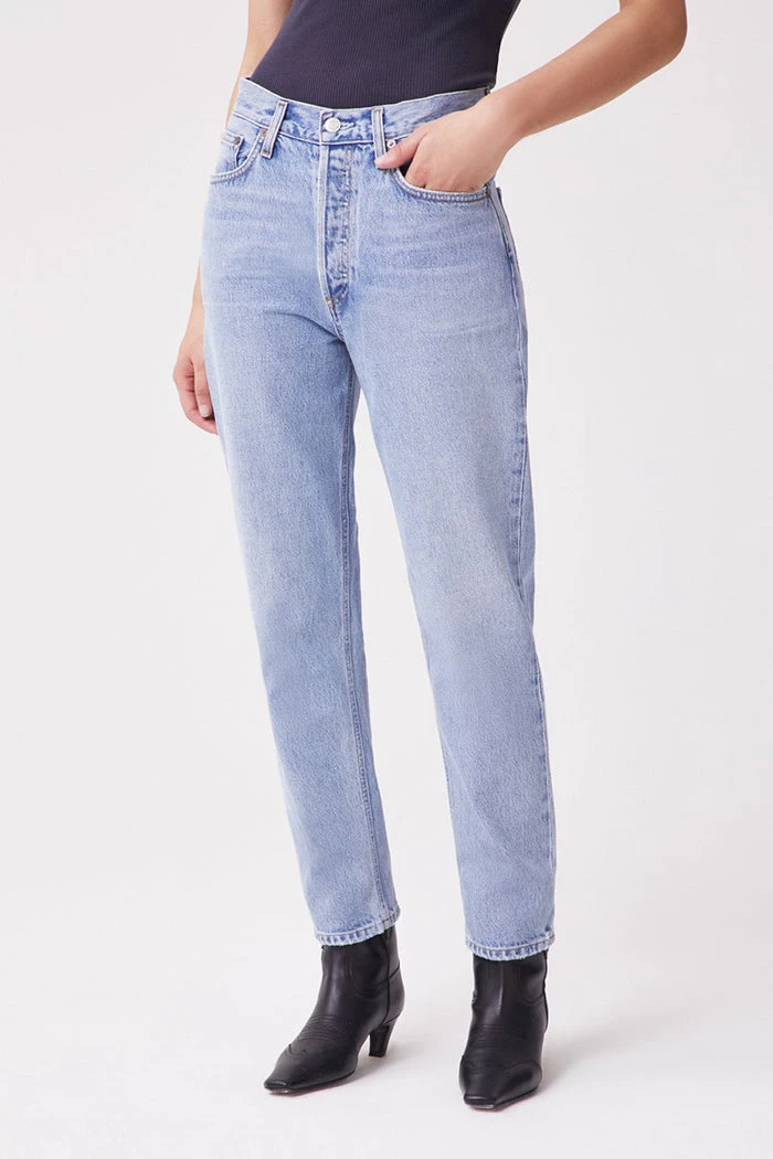 Agolde Fen high rise taper in clean light indigo Dimension wash. This ultra-flattering fit is cut with a high rise, relaxed top block and gentle taper, cut to the ankle. Crafted from non-stretch denim in a vintage inspired wash, the Fen is your new wear-with-everything pair. Button fly.