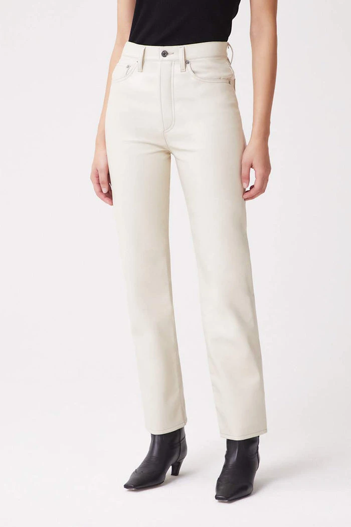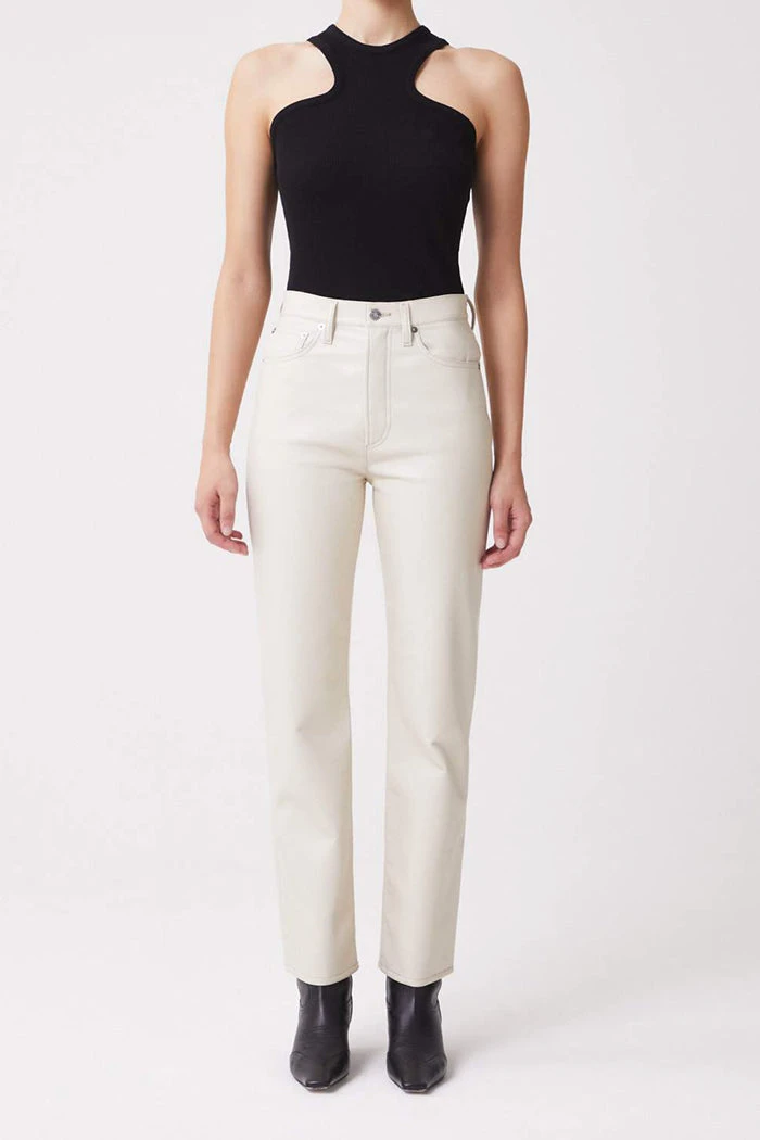 Agolde 90’s pinch waist powder cream recycled leather pants. This perfect vintage inspired straight sits neat at the true waist with a close-fitting top block, finished with an easy leg and button fly. Crafted in a sleek black, style yours with a tonal ribbed tank or the Paloma Vegan Leather Shirt for a head-to-toe look.