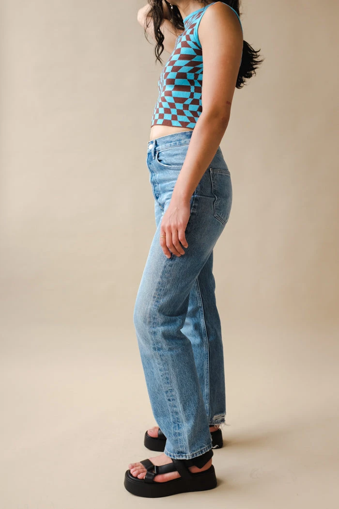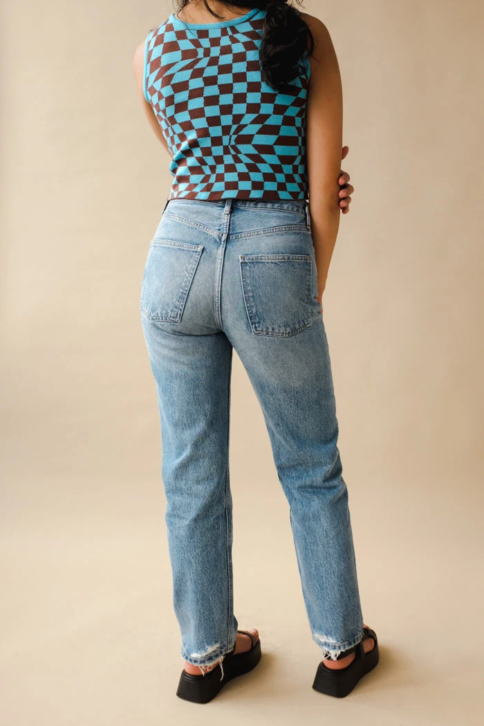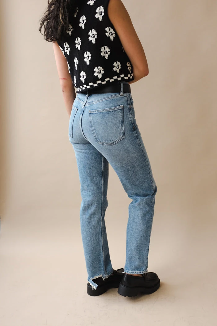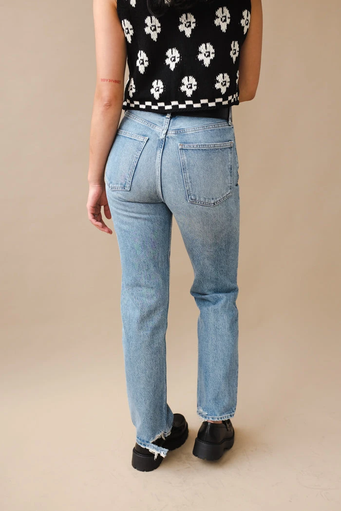 Agolde 90’s pinch waist, high rise in medium blue wash Endless. This is an update to the best selling 90’s jean, but meant to fit more high rise and fitted through the waist. Distressing on back of hem.