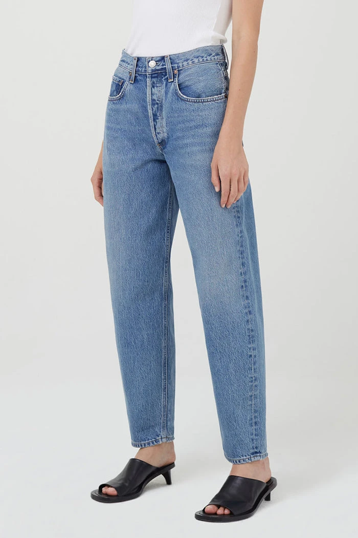 Agolde Tapered Baggy jeans in medium passenger wash. This 80’s inspired silhouette is cut with a roomy leg and tapered ankle. Sitting high on the waist, the Tapered Baggy pairs well with a tucked in t-shirt or cropped sweater. A non-stretch fabric that’s soft to the touch. Button Fly.