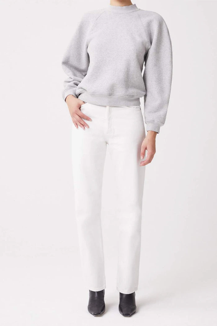 Agolde Tarron mock neck sweatshirt in heather grey. The high neckline and roomy sleeves add controlled volume to this comfortable classic.