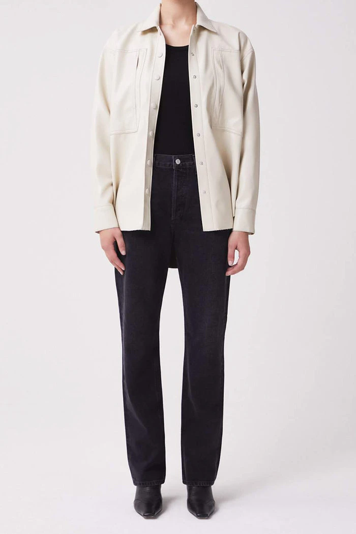 Agolde Utility vegan leather shirt in powder. Luxe matte powder white vegan leather with buttery hand feel and gentle drpae. Cut with an oversized silhouette in our smooth vegan leather, the Utility shirt has a pointed collar, oversized pockets and snap front closures and cuffs. Layer over a classic t-shirt or pair with tonal leather for a head-to-toe look.