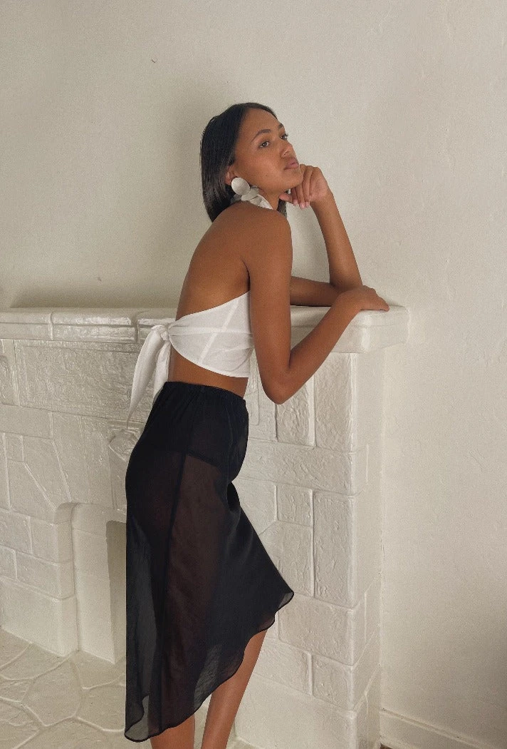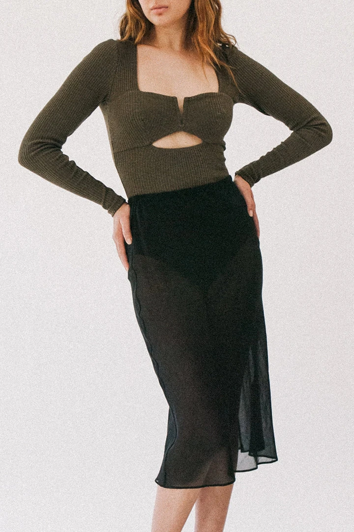 Angie Bauer Carly sheer high rise silk-cotton bias cut midi skirt with an elastic waistband in black.