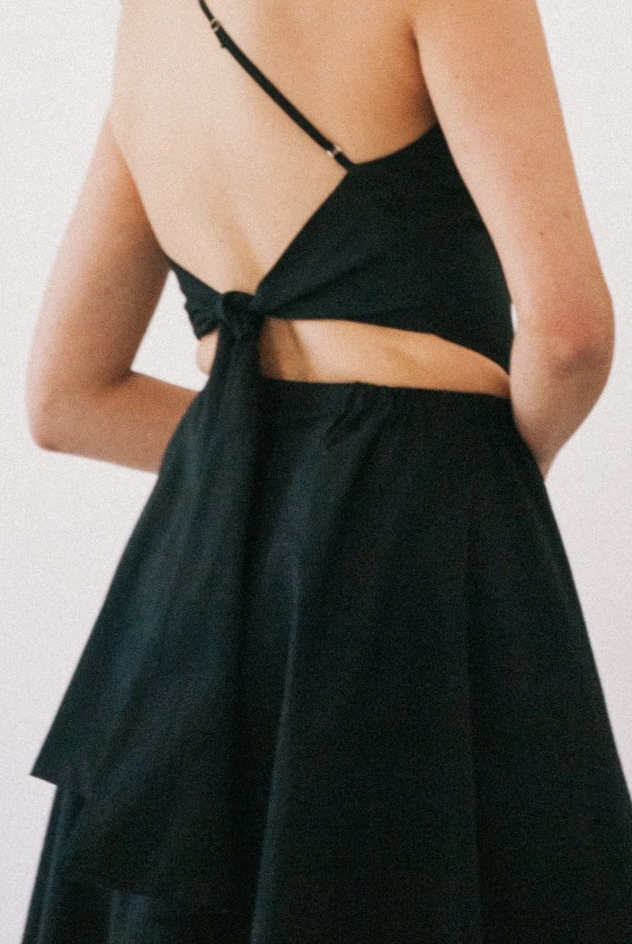 Angie Bauer black Corsica one shoulder top with a thin, diagonal strap across the back and fastens at the back with long ties. The neckline can be ruched to adjust the placement and fit. Fully lined.