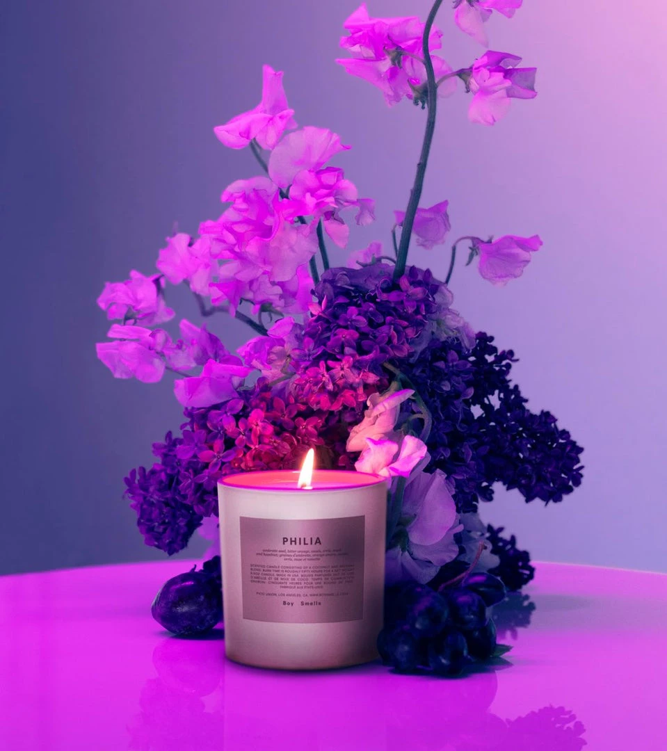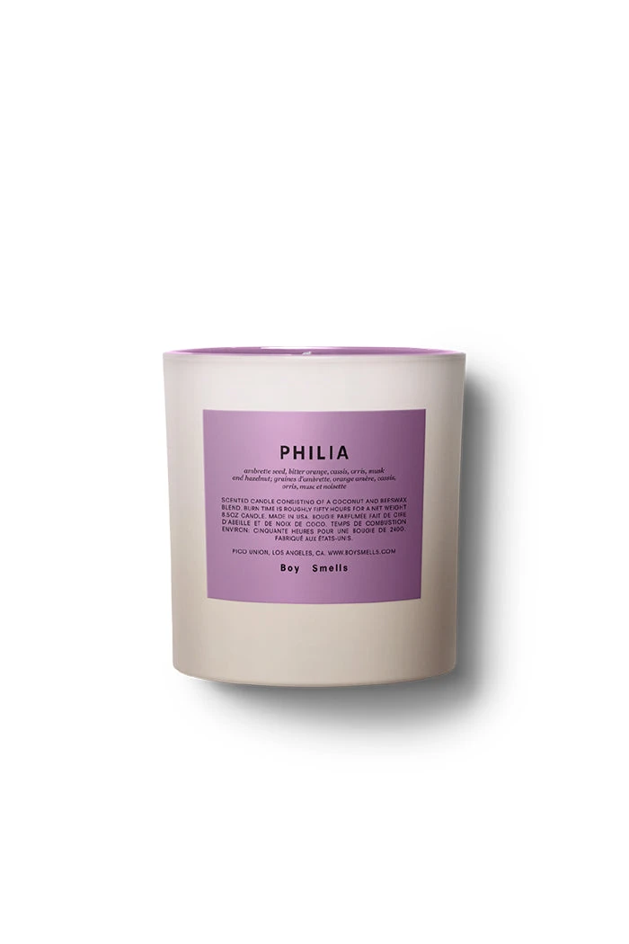 Boy Smells Philia candle from the 2021 pride collection. Filled with deep desires, this scent is best described as a spiced and lustful floral tonic. Wild notes of ambrette seed, orris and musk and softened by bitter orange and cassis fruit.  PHILIA, translated as “brotherly love”, is one of the four ancient Greek words for love. In this moment, it is sensual, sophisticated and gorge, producing a palpable tension between beauty and desire.Â