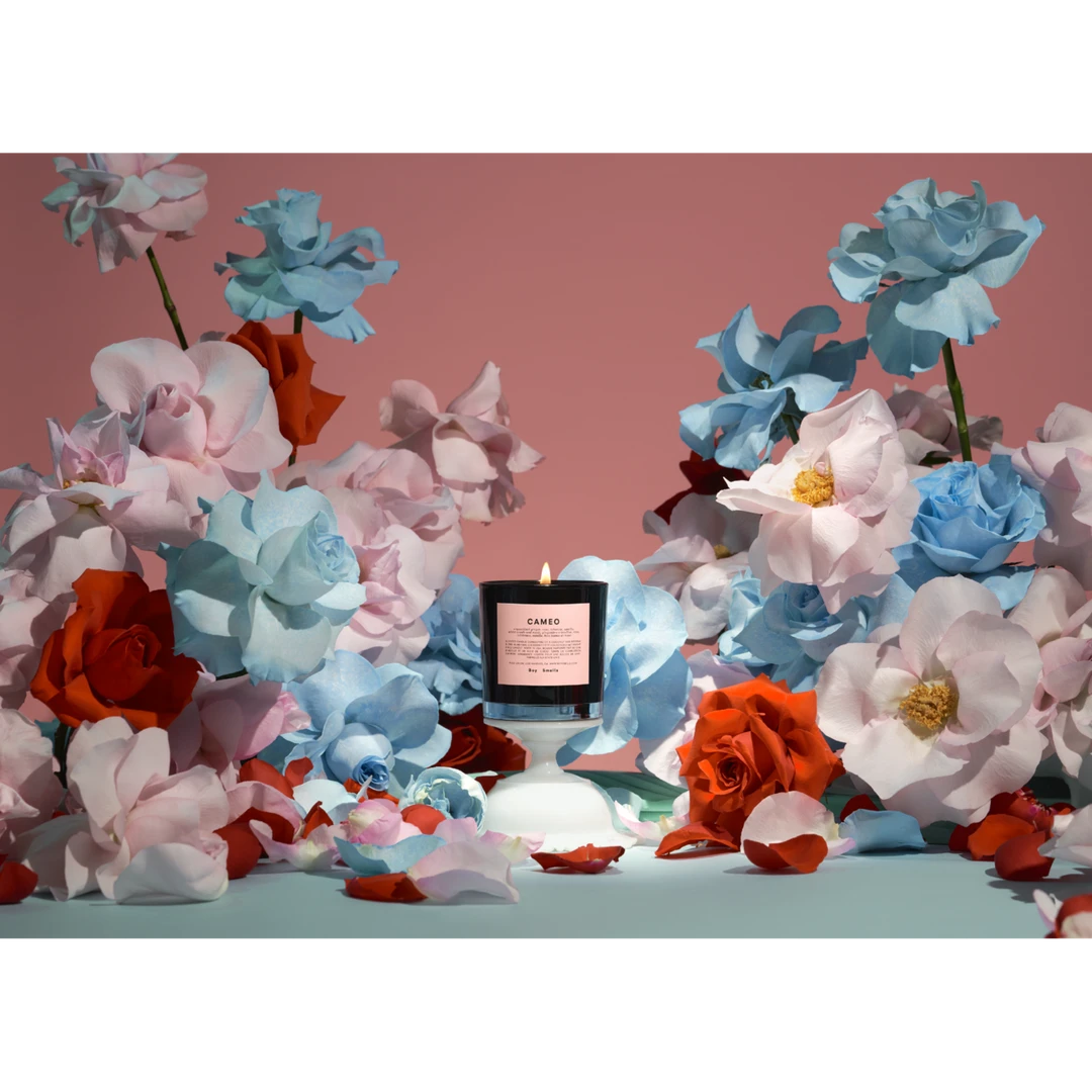 Boy Smells Cameo candle. Crystalized ginger, rose, tuberose, vanilla, white woods and musk. Cameo evokes the strength and softness required to be kind in a not-always-kind world. As the light flickers, the spice of crystallized ginger, warmth of vanilla, and grounding power of rose inspire us to dream of a place where empathy is the default. Inspired by Andy Warhol’s polaroid of Dolly Parton, CAMEO is absurdly pretty, to a subversive degree. It is named after the Wedgewood porcelain pendants, depicting portraits in profile set against the typical color pink.