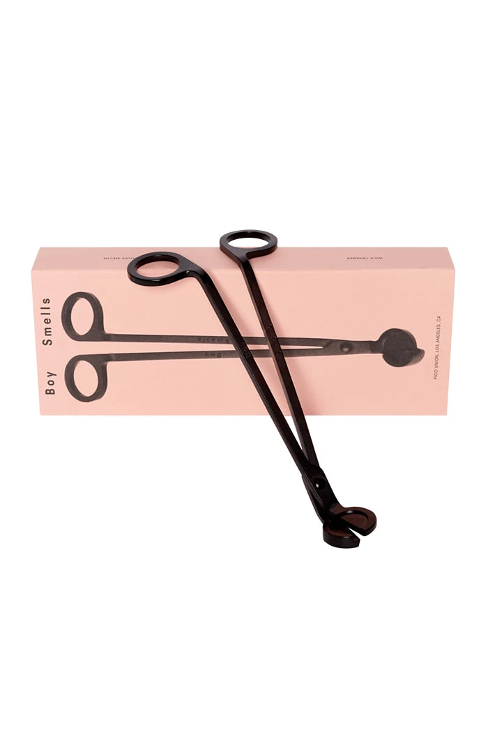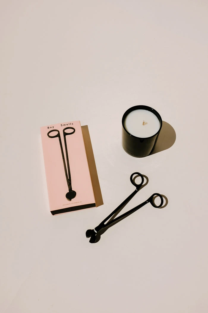 Boy Smells matte black branded wick trimmer. This functional object will keep your wick neatly trimmed before each burn, aiding in the reduction of soot and smoke that may occur when a charred wick is left too long. The cutting process captures the excess wick for easy discarding. Pragmatic!
