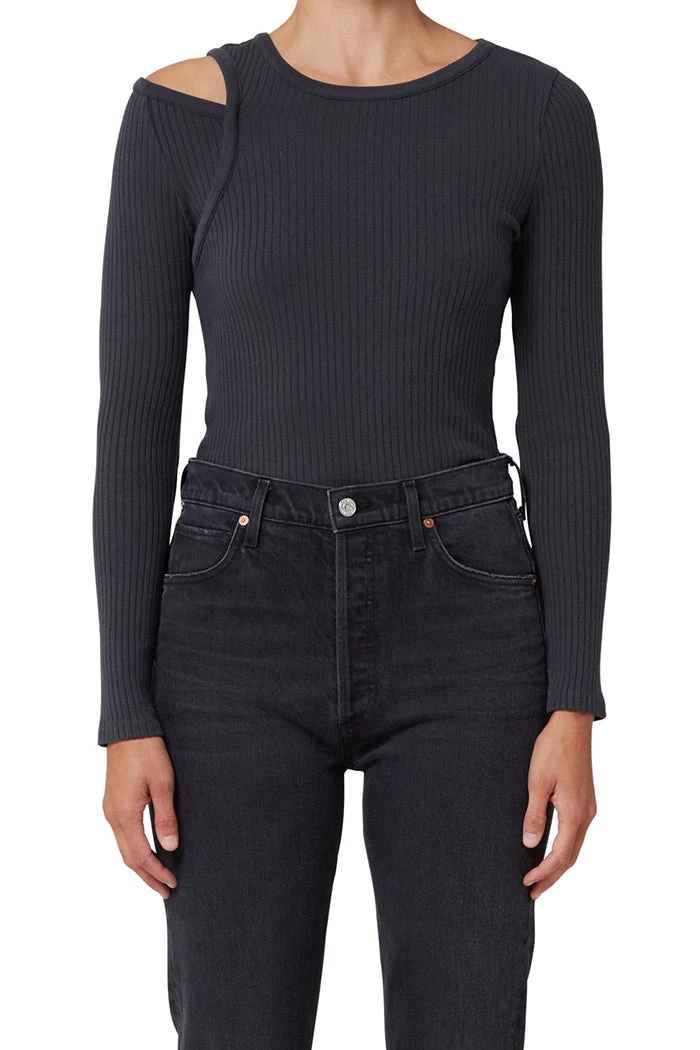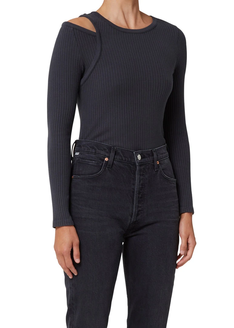 Citizens of Humanity Rianne cutout, long sleeve, ribbed, layered top in charcoal. This stretchy ribbed top has a cut out on one shoulder, that creates a modern asymmetric layered effect.