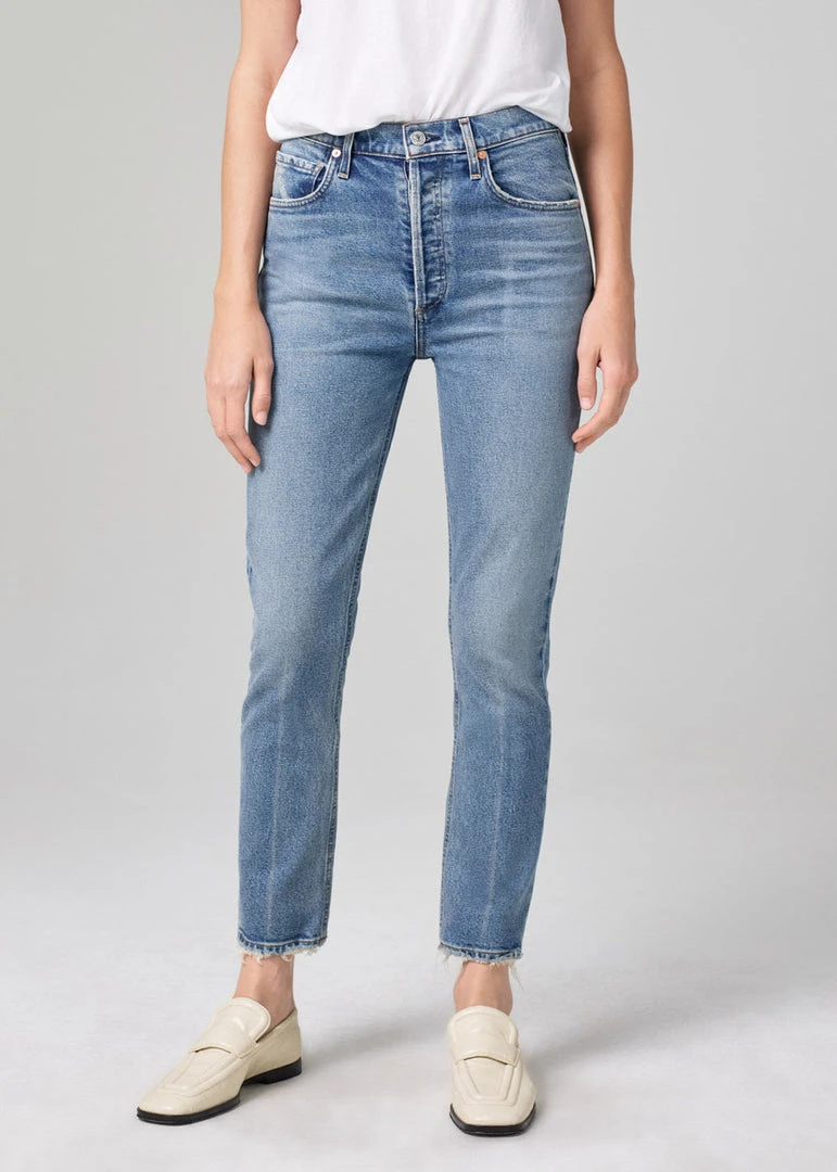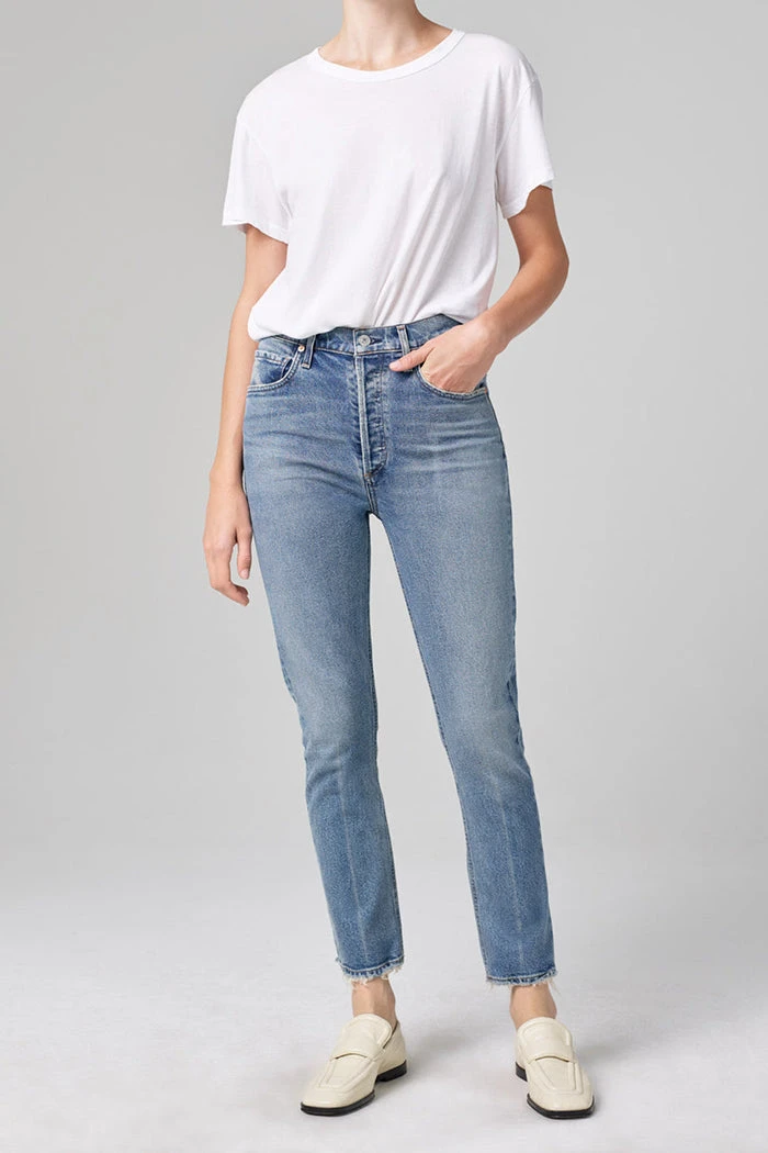 Citizens of Humanity Jolene high rise vintage slim straight in medium blue dimple wash. Sitting right at the waist and perfectly contoured through the hip in thigh for an incredibly contoured fit. Comfort stretch denim with a soft hand and vintage character. Button fly.