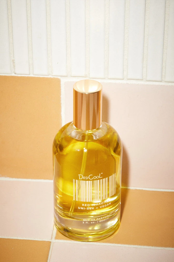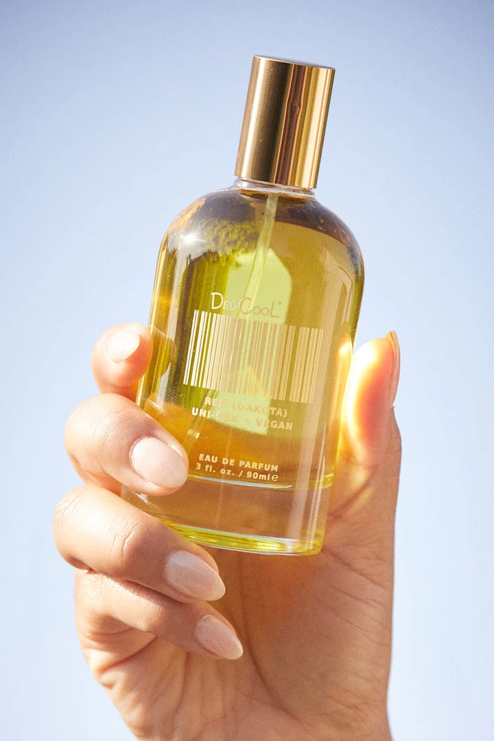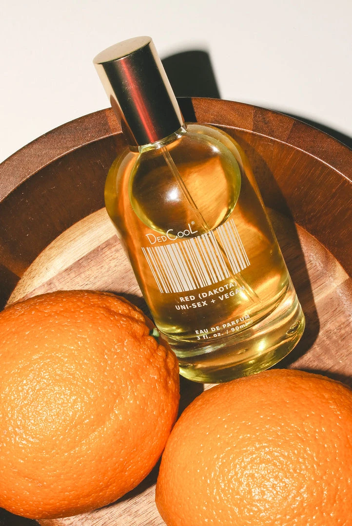 Dedcool Red Dakota eau de parfum fragrance. A citrusy blend of heady gardenia accord with notes of amber and undertones of woods. The fresh floral scent embodies the dark varieties of wild berries.
