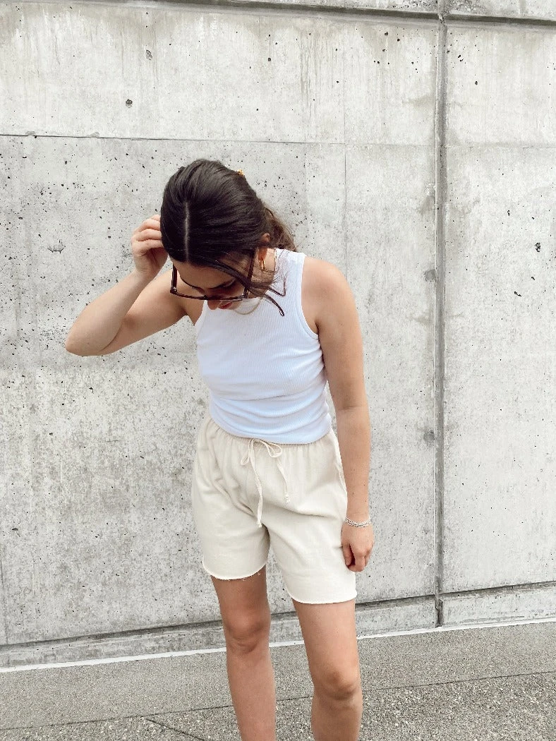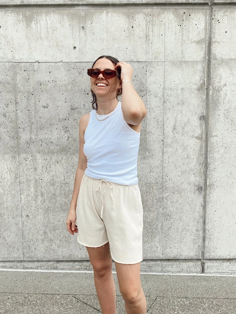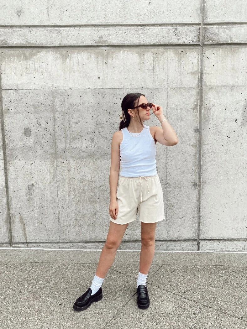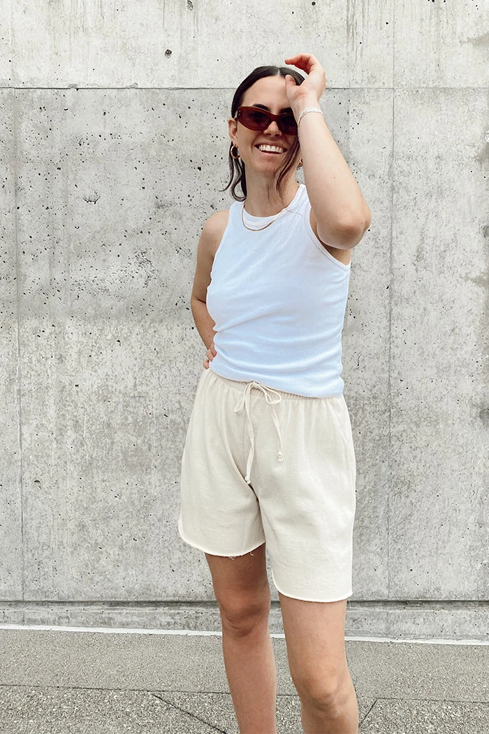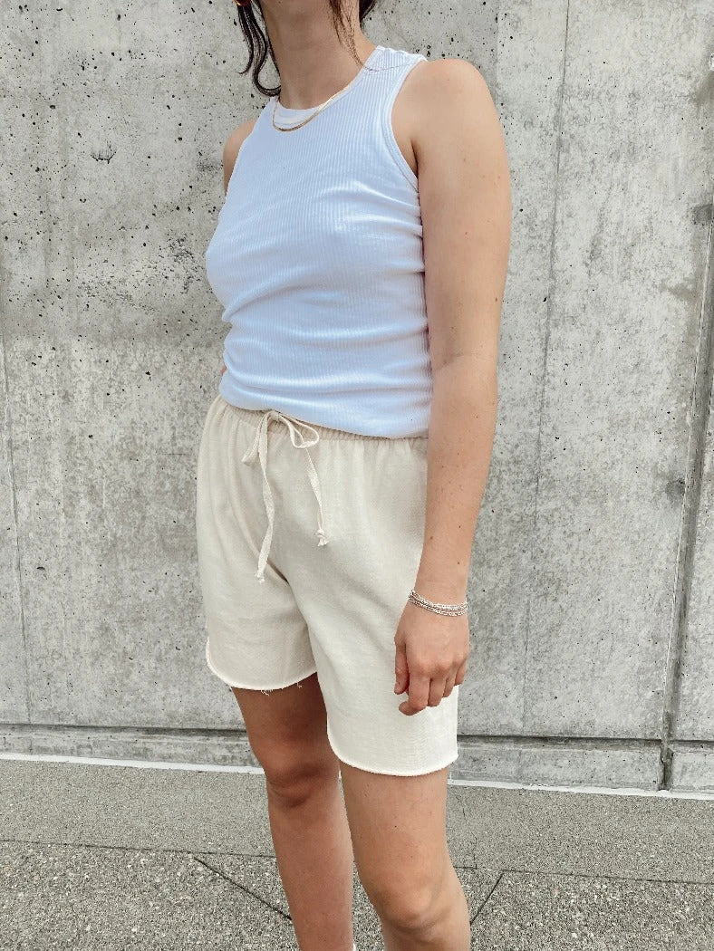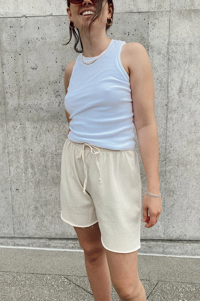 Organic cotton cream sweat shorts.