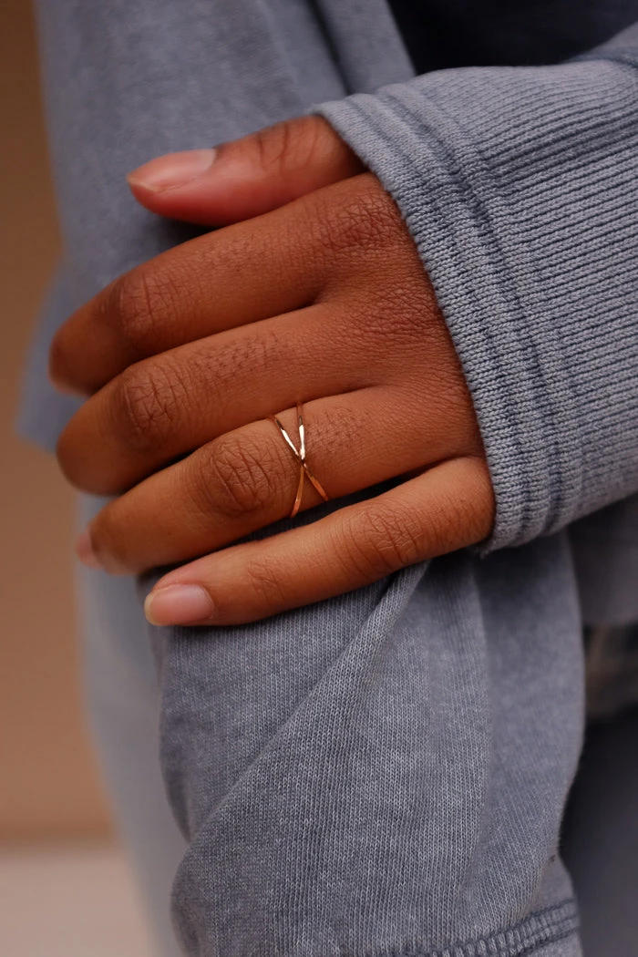Hannah Naomi hammered X ring in 14k rose gold fill.