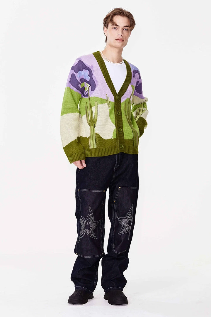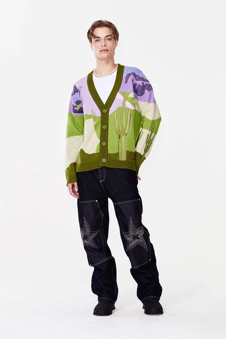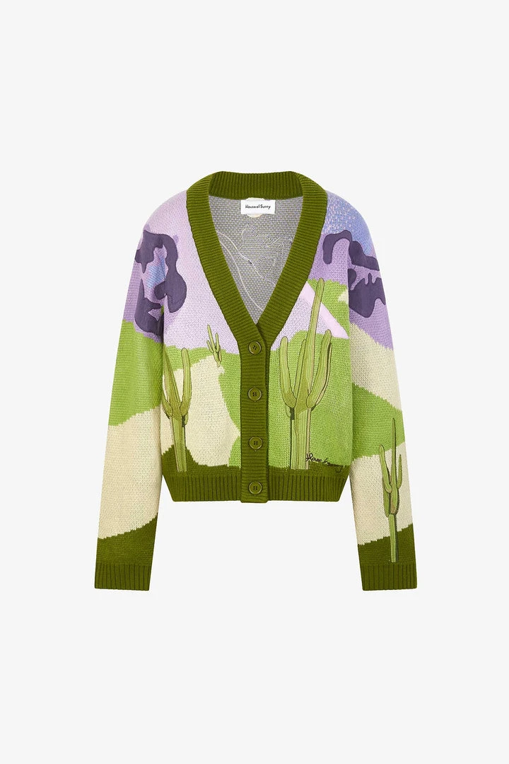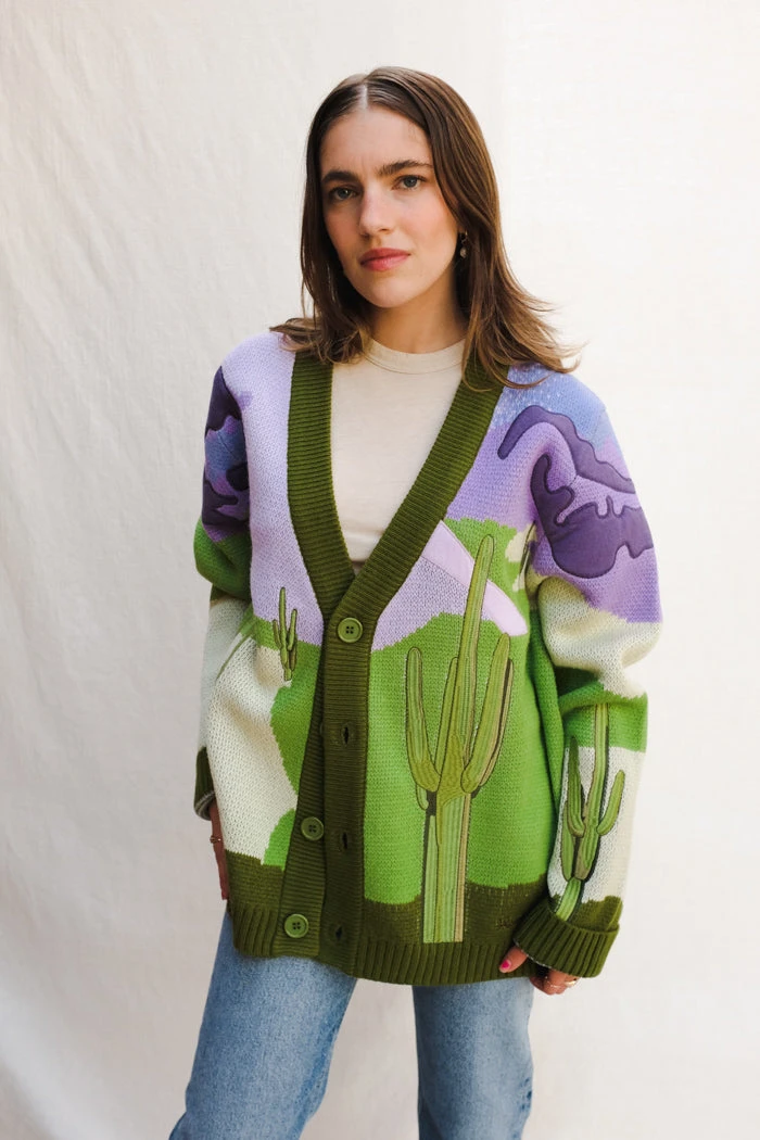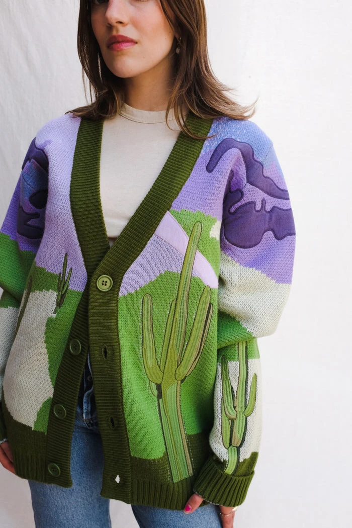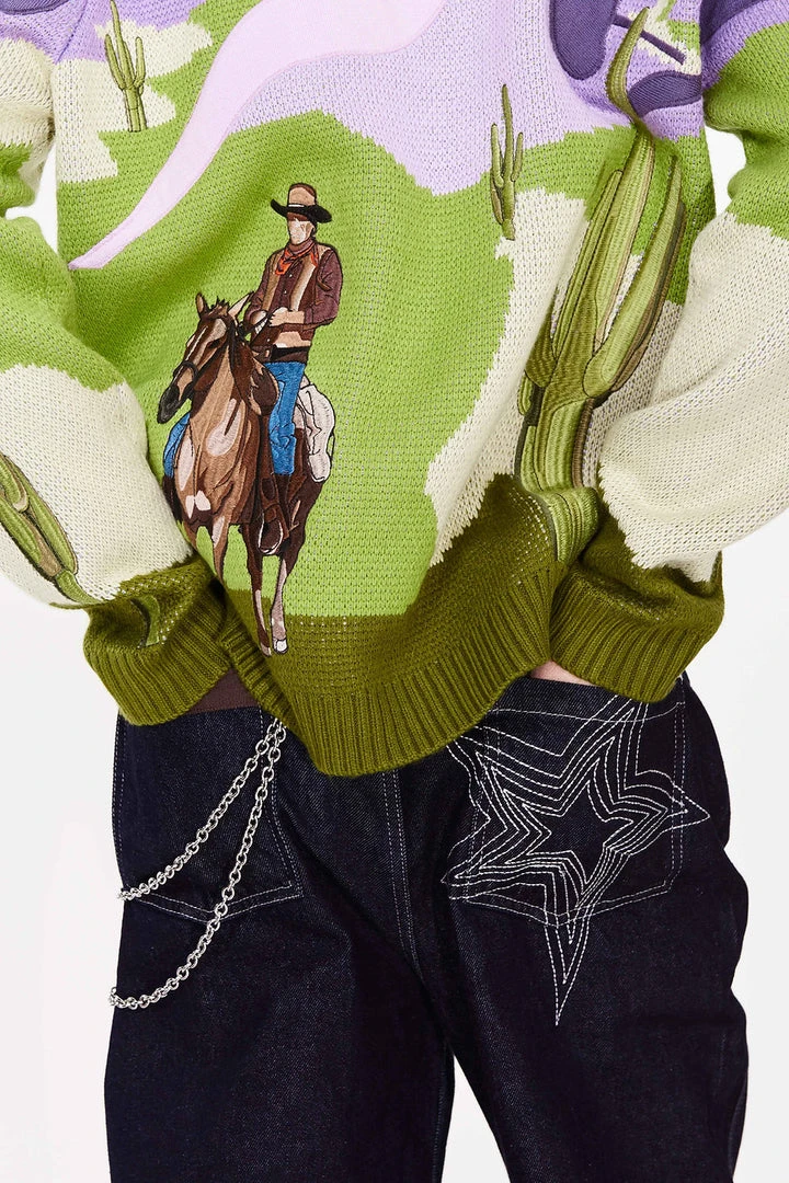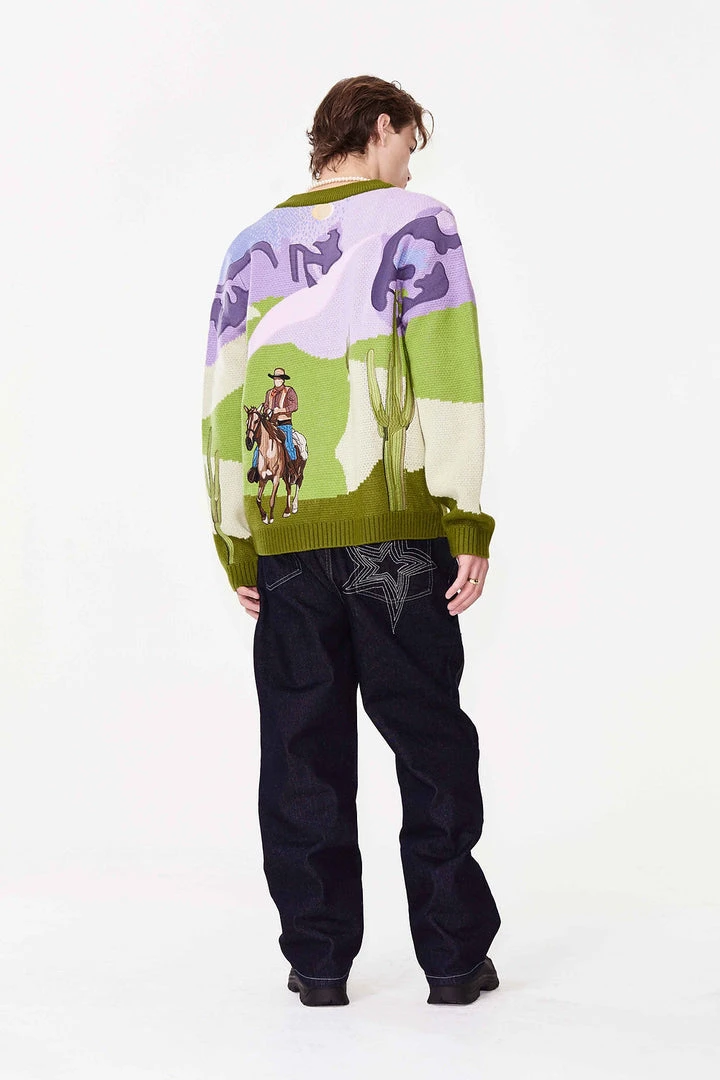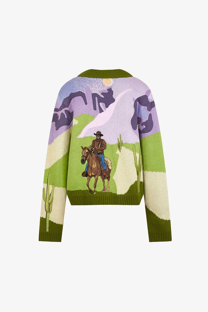 House of Sunny Clint colorful slouchy cardigan with western cowboy embroidery.