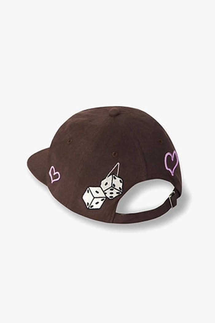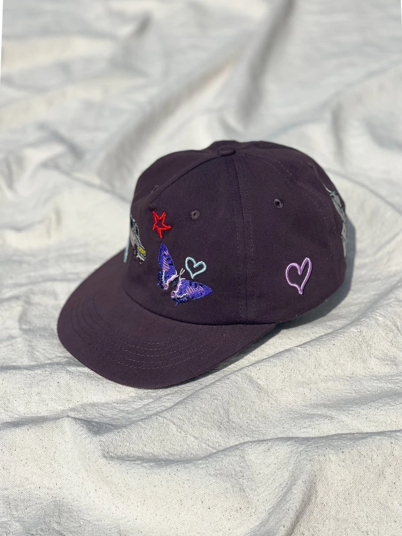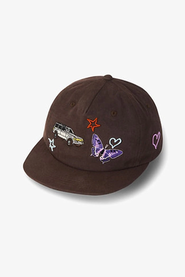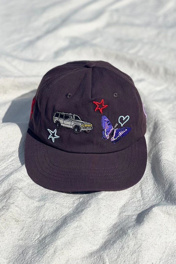 House of Sunny Journey hat in chocolate brown. A colorful collection of patches and embroidery: stars, butterfly, dice, SUV ready to road trip.  It has a nonchalant fit, which can be adjusted with a cinch-strap fastening in the back.