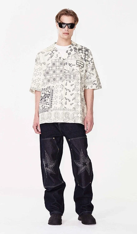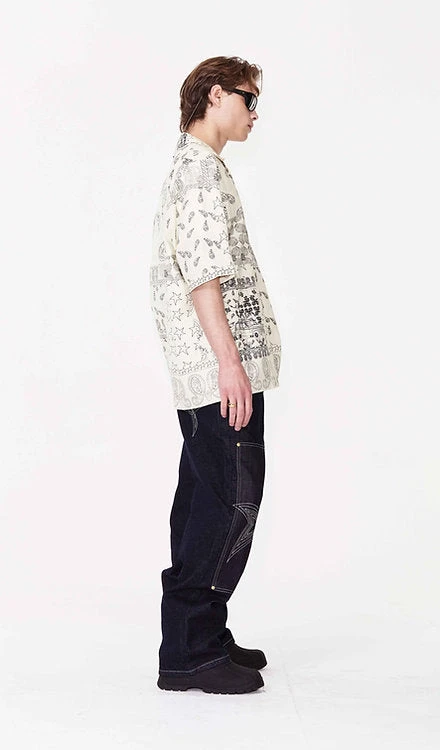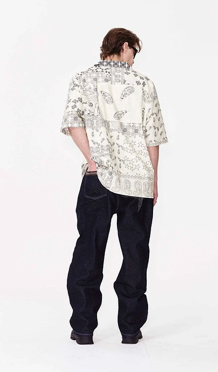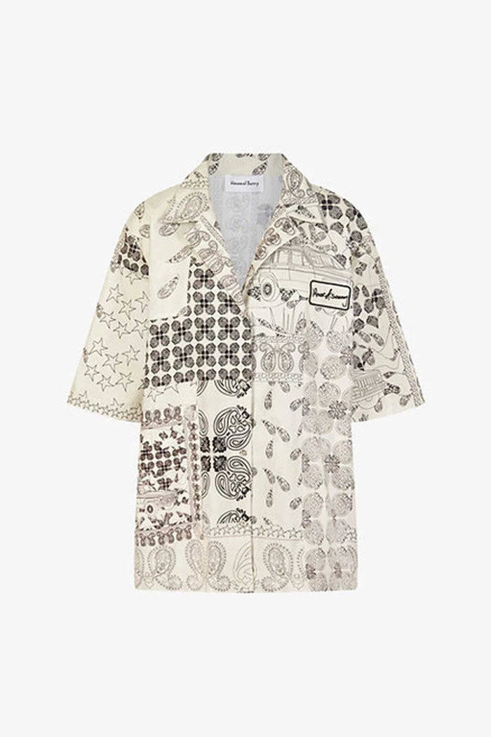 House of Sunny button up oversized Roadie shirt with brown printed paisley block print.
