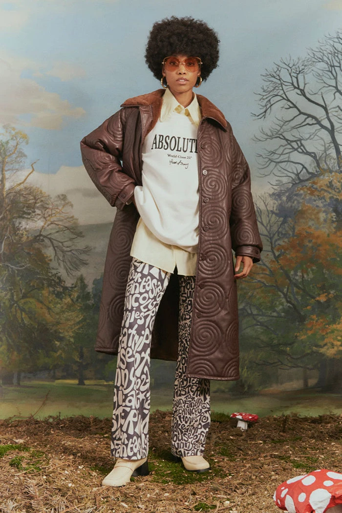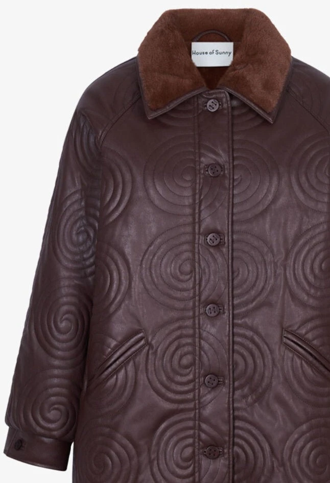 House of Sunny vegan leather Cosmo forever & ever, swirl quilted overcoat in rich chocolate brown. Fully faux fur lined, HOS logo embroidered on back.Â