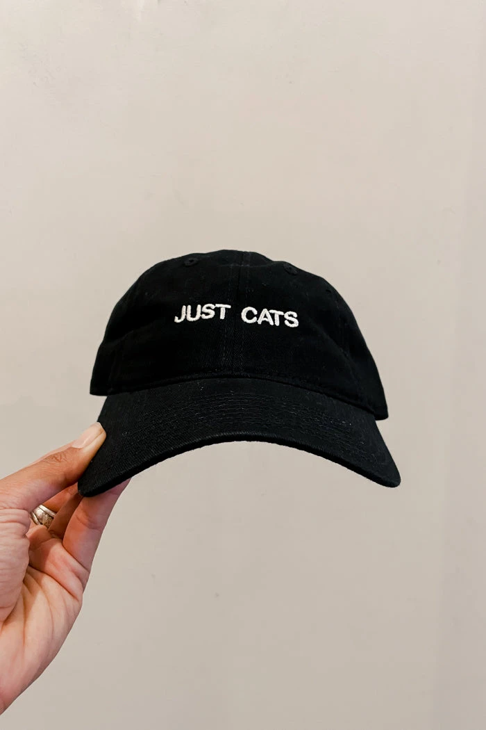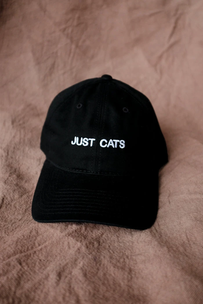Just Cats embroidered black hat with white writing.