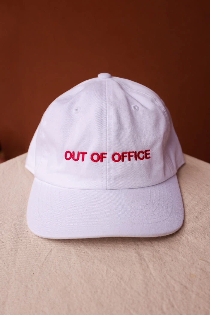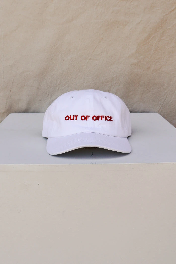 Intentionally Blank “out of office” embroidered adjustable hat. White hat with red embroidery.