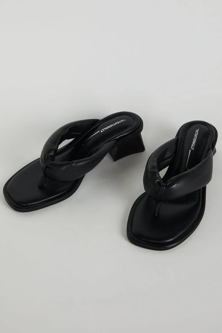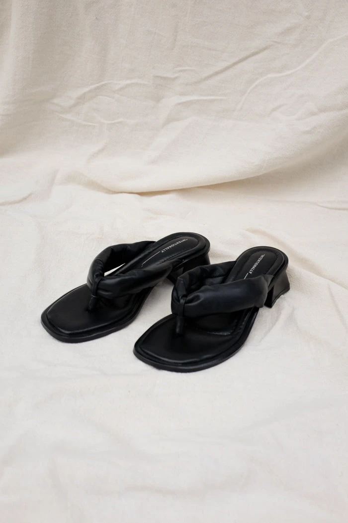 Intentionally Blank Whitman sandals in black. The ultimate puff daddy, the whitman thong is so chic on the foot, with oversized, over puffed straps and the perfect sculptural heel. Soft leather straps, padded foot bed.