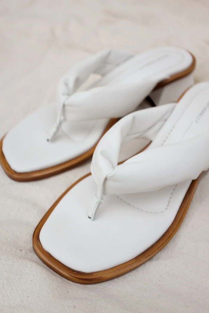 Intentionally Blank Whitman sandals in white exclusively made for Pipe and Row. The ultimate puff daddy, the whitman thong is so chic on the foot, with oversized, over puffed straps and the perfect sculptural heel. Soft leather straps, padded foot bed.
