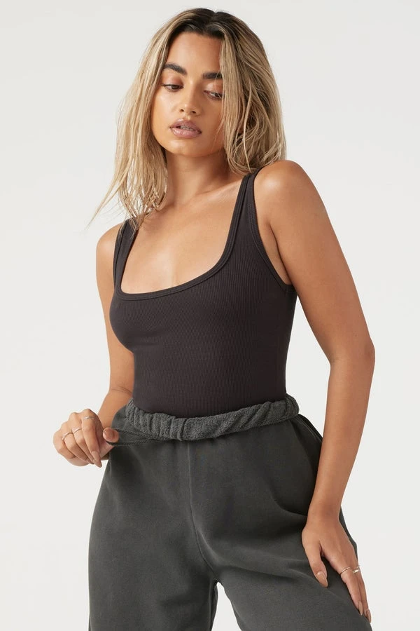Joah Brown ribbed, full length, ultra fitted Scoop Neck Tank in vintage black.