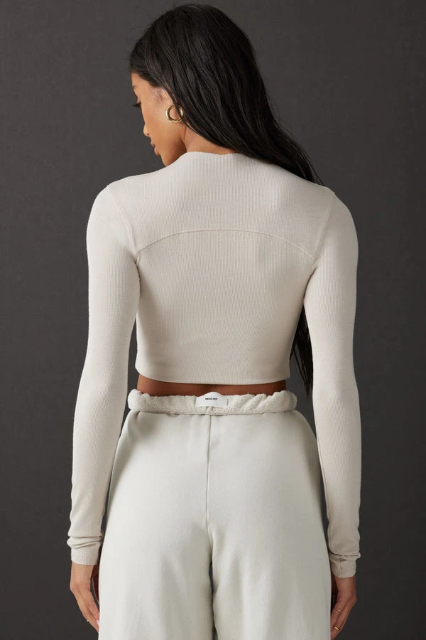 Joah Brown Contrast Stitch long sleeve cropped ribbed top with mini mock neck in light tan dune.