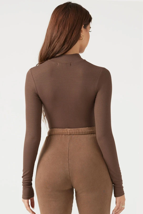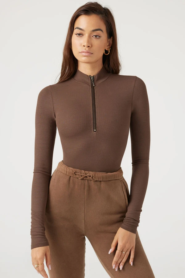 Joah Brown fitted half zip mock neck ribbed top in brown.