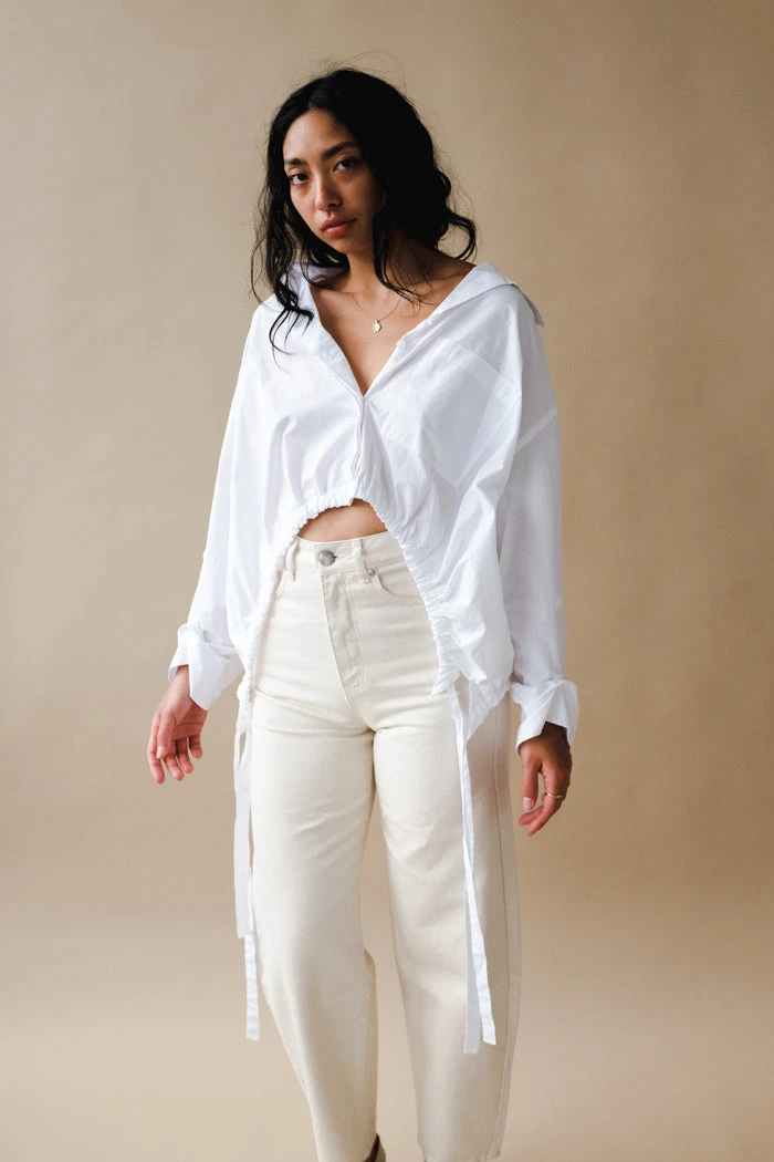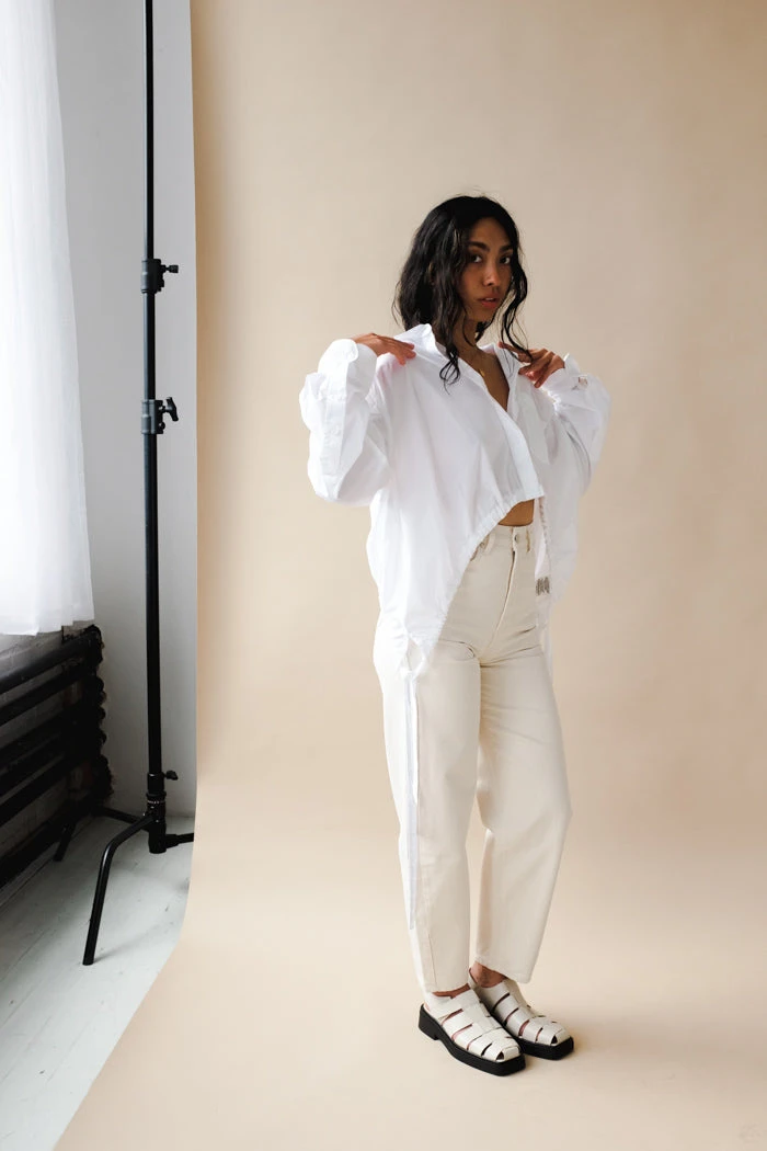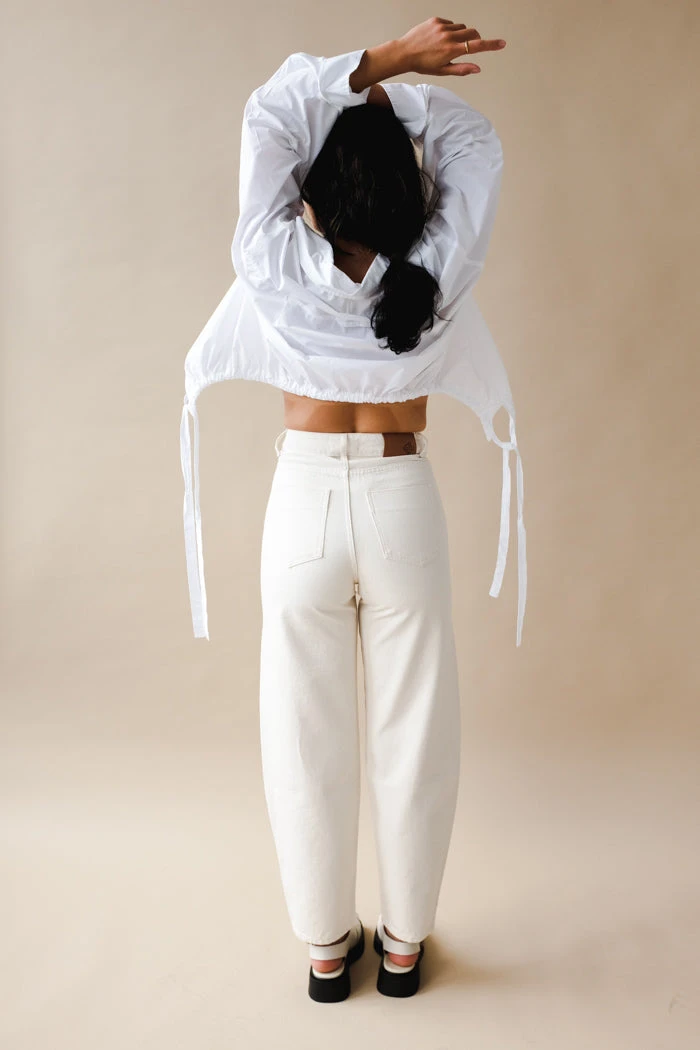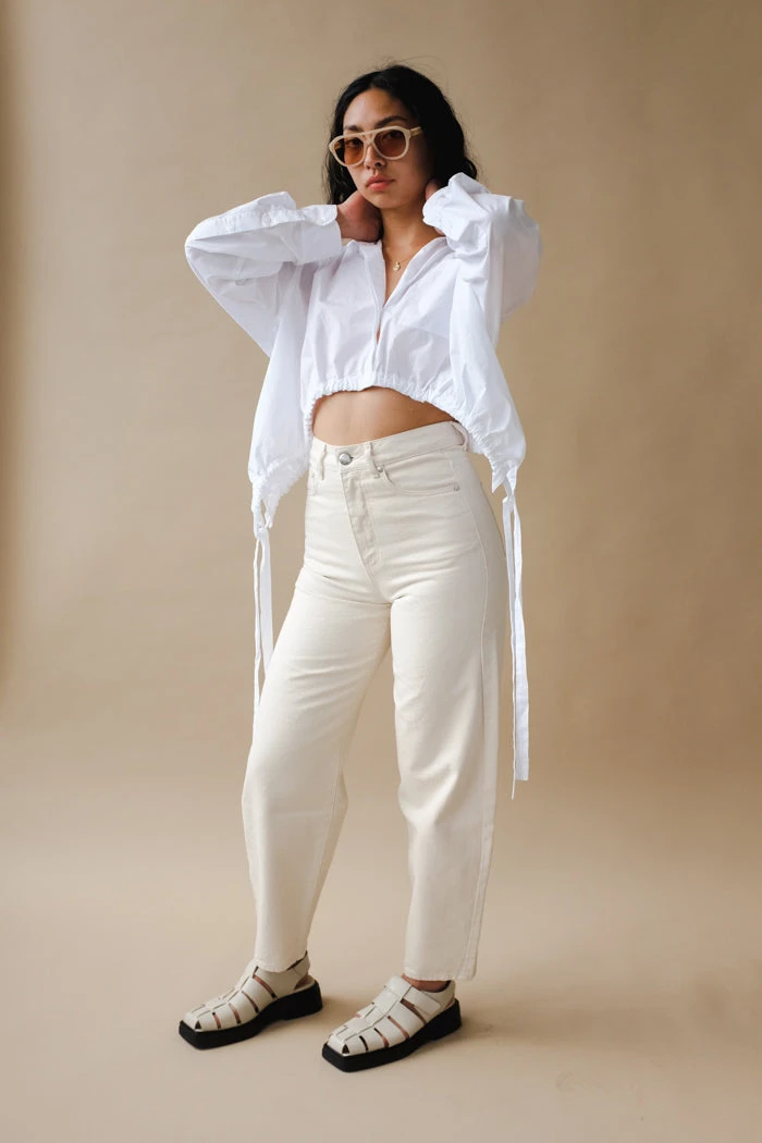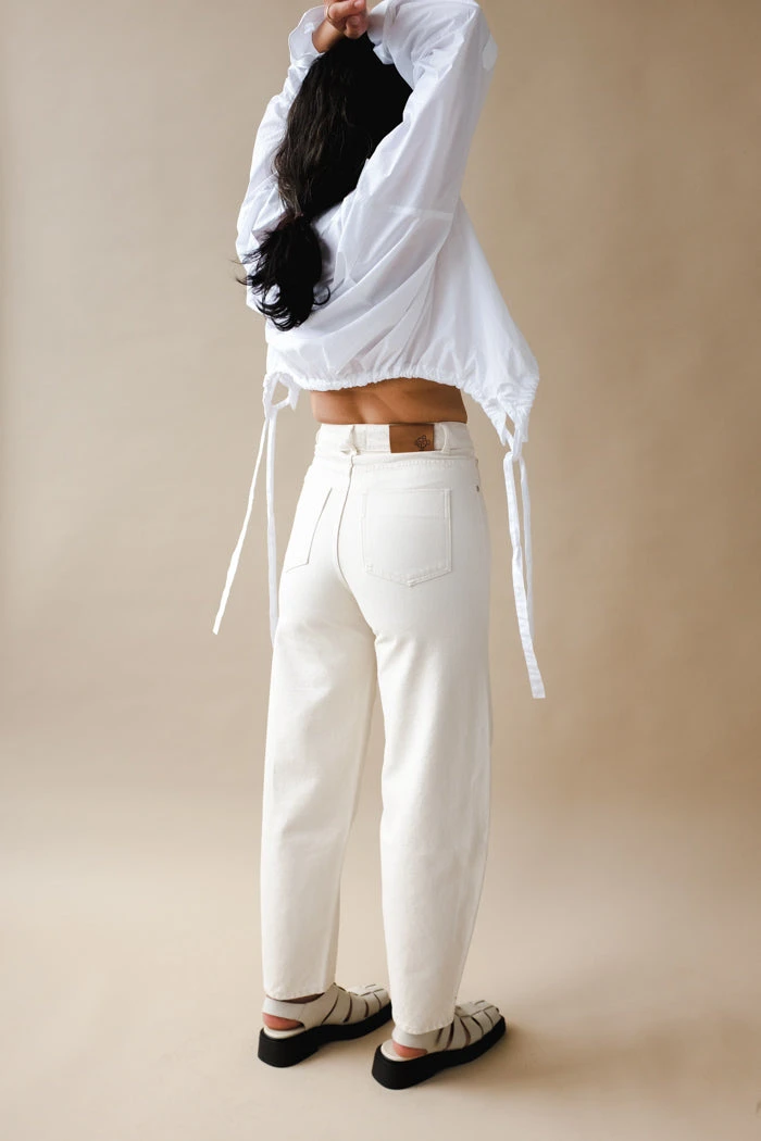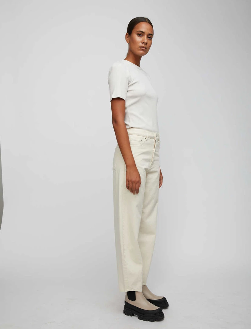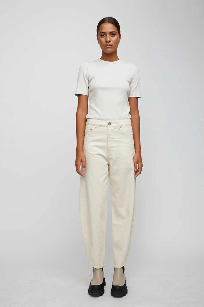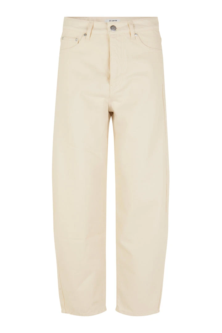 Just Female off white, boyfriend style Bold denim jeans. The fit is high-rise with bowed legs that cut above the ankle.