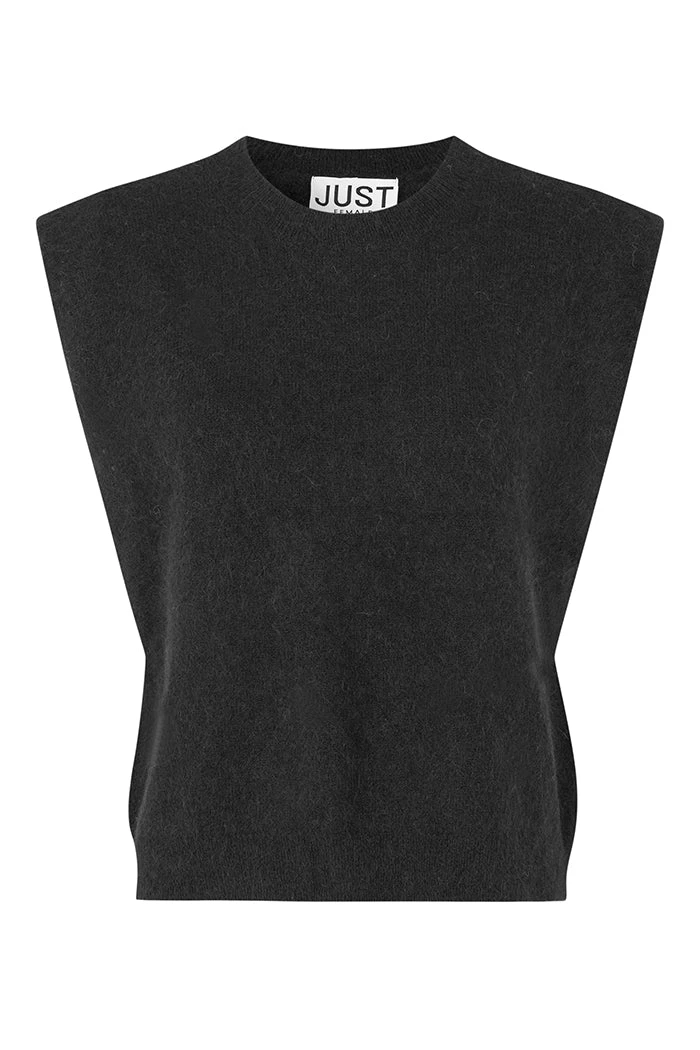 Just Female Coldy knit vest in black. Warm and soft knitted vest made from a certified mohair blend. The vest has a round neck with rib, defined shoulders, and is slightly oversized. Style it over anything from blouses to shirts and dresses on colder days.