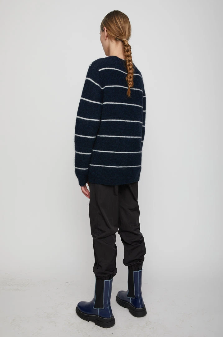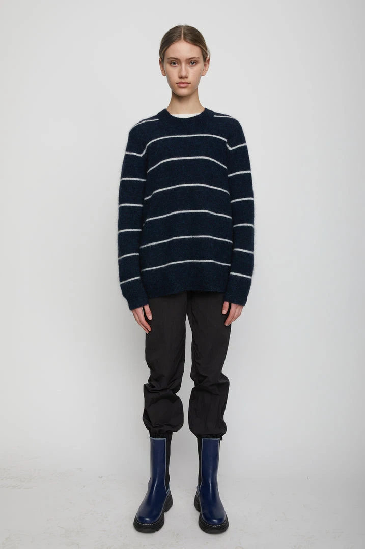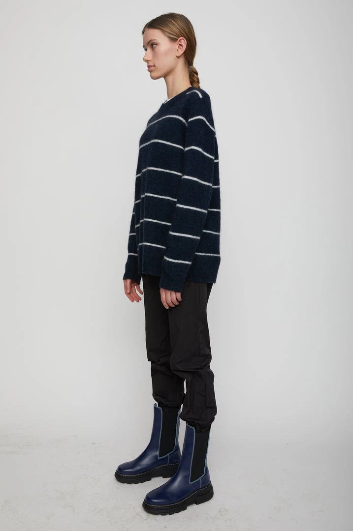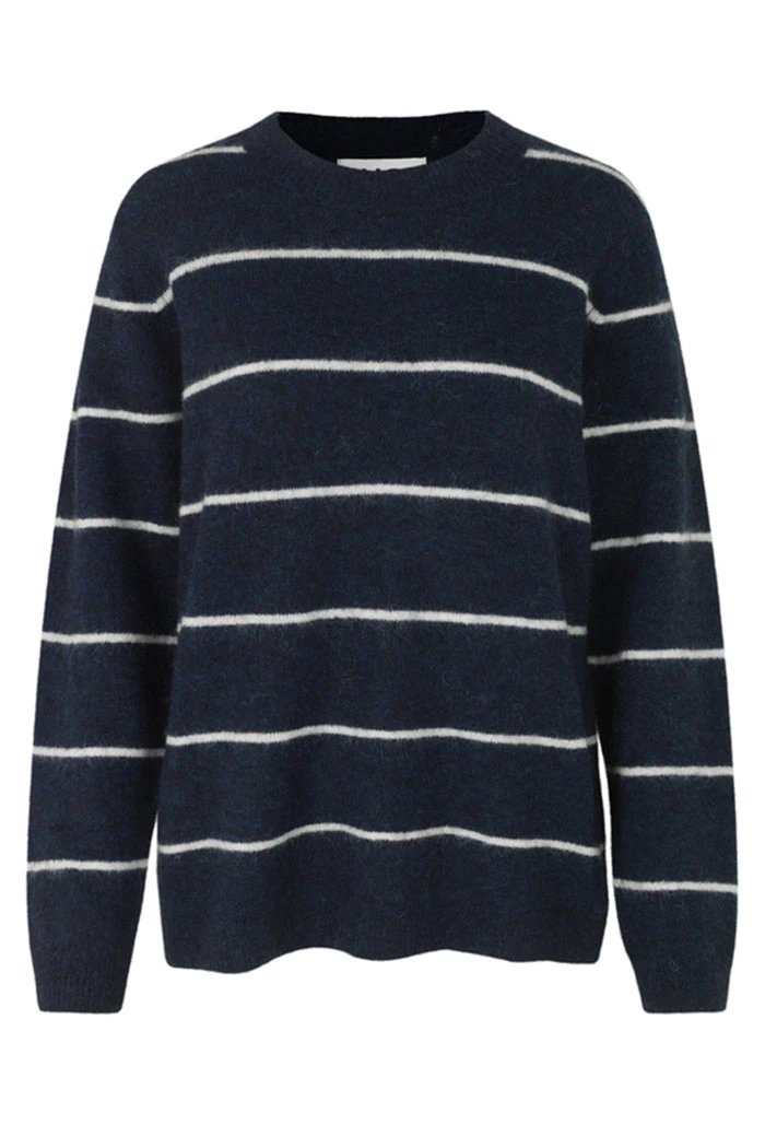 Just Eos classic knit sweater in navy blue with white stripes. This sweater has a round neck with rib, long sleeves, and oversize fit.