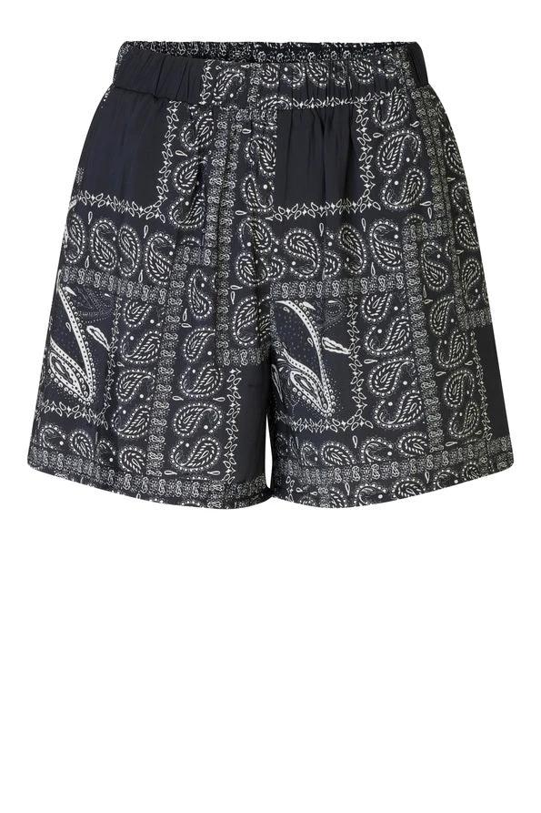 Just Female lightweight black Maid shorts in all over white paisley print. They have an elastic waist and side pockets. Style them with the Maid Shirt for a cool and casual full look.
