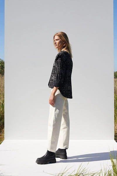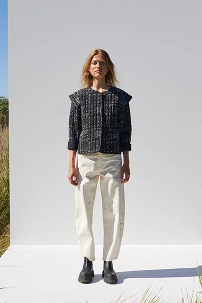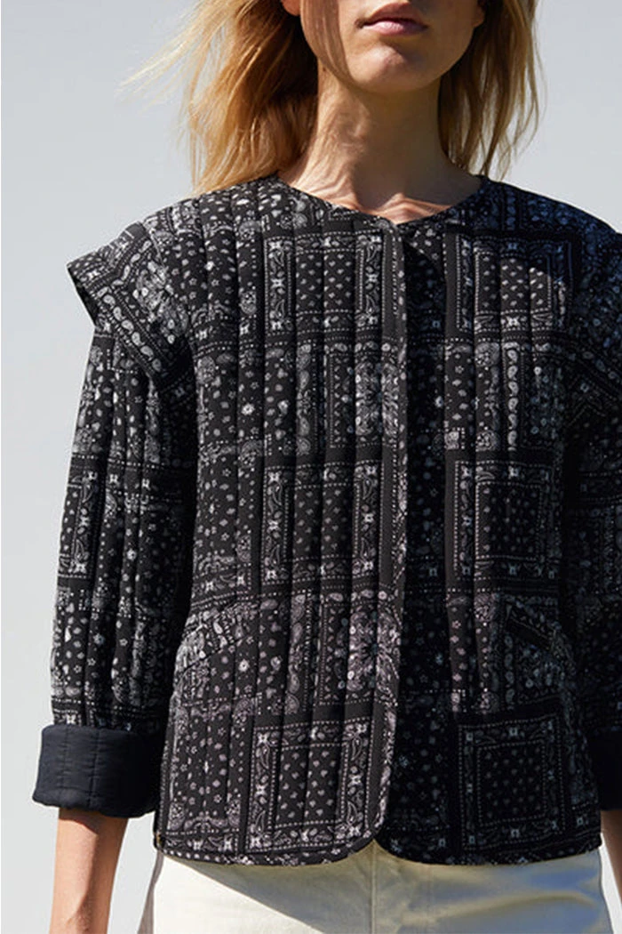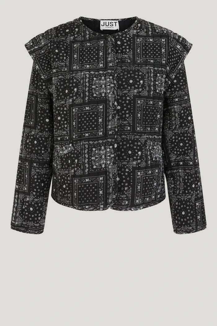 Just Female quilted padded Miracle jacket in black paisley print. This statement making coat has a hidden button closing and cool accentuating shoulder details.