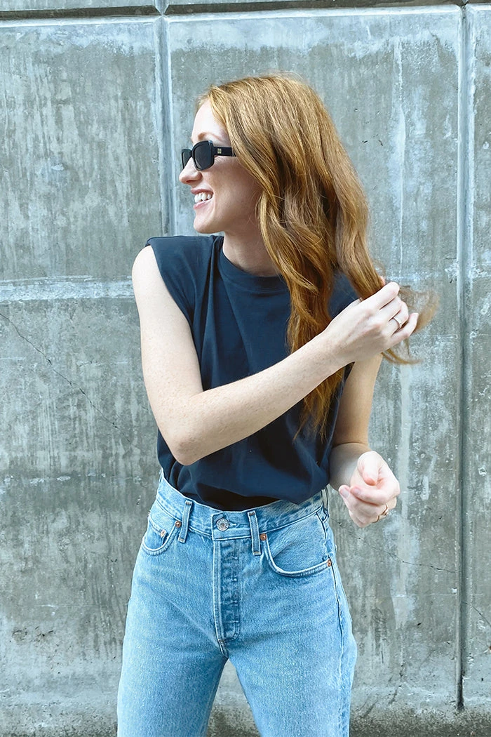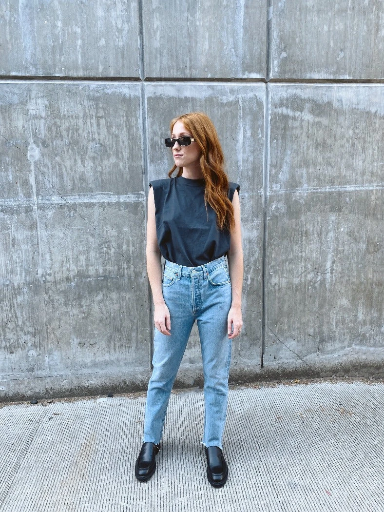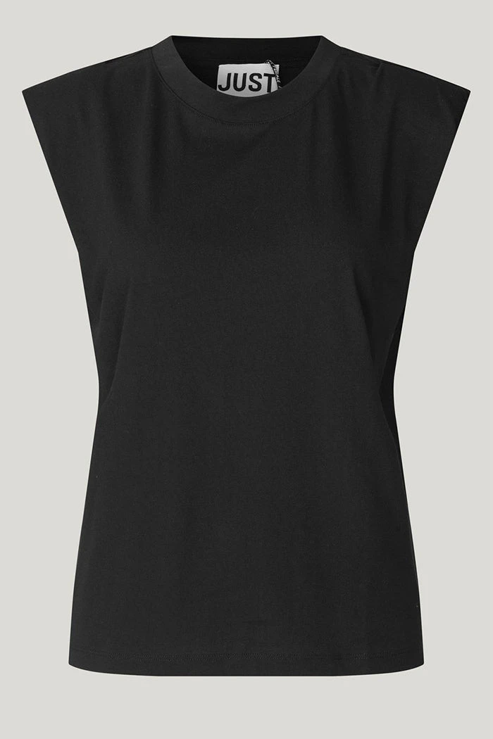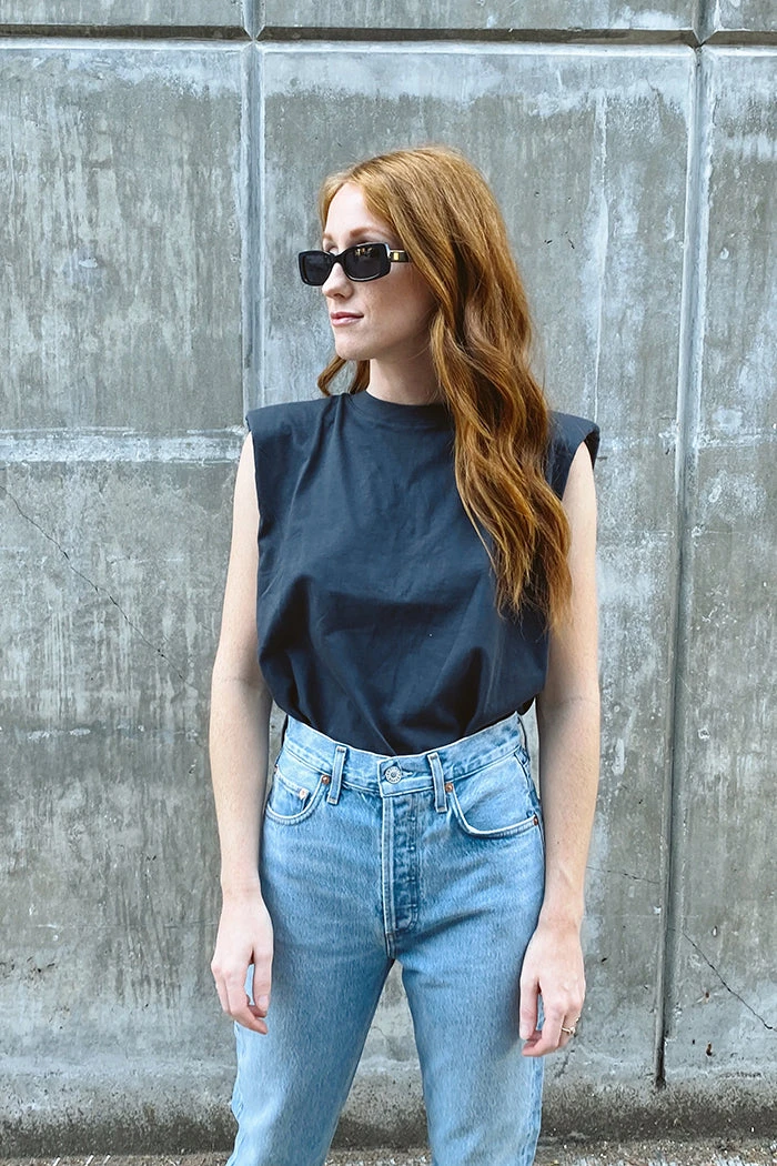 Just Beijing tank top in night washed black. Cool masculine top made from 100% organic cotton. This basic tee with a twist is sleeveless and has accentuating shoulder pads.