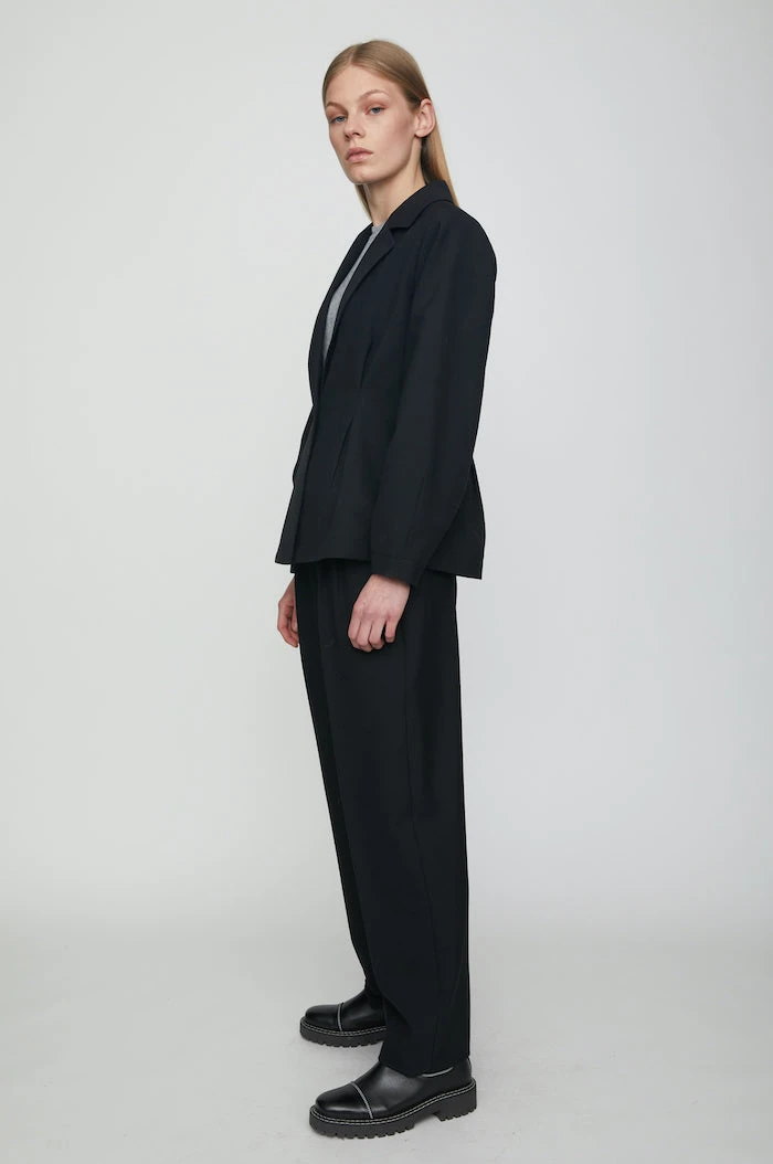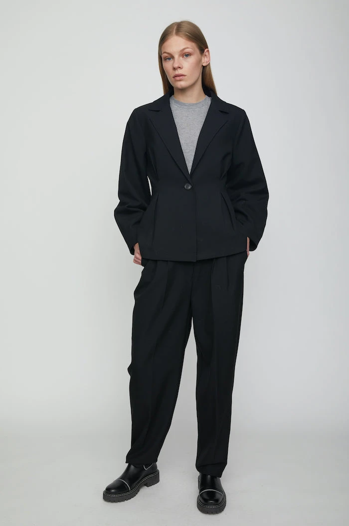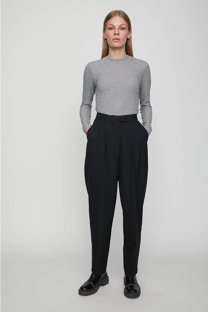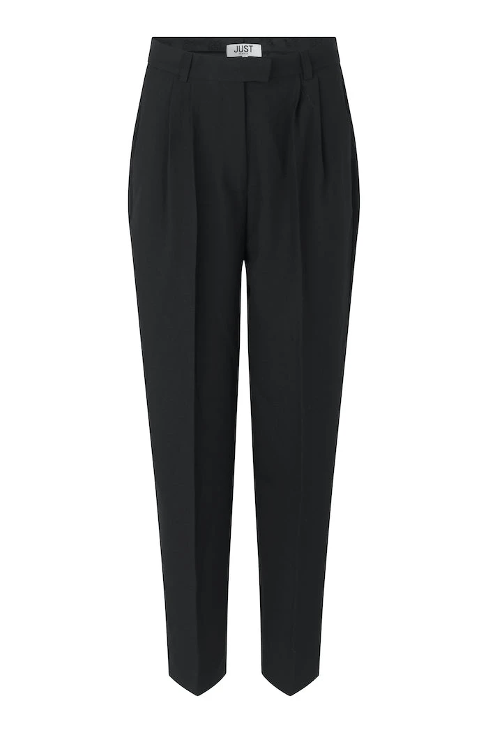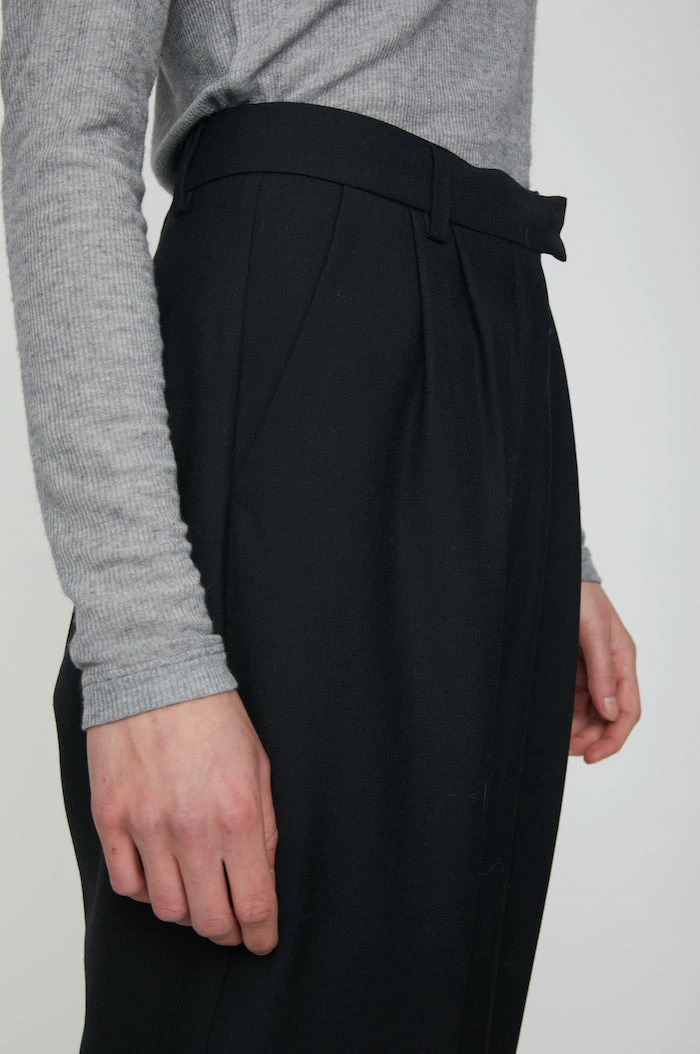Just South trousers formal high-waisted trousers made from a warm polyester and wool blend. They have a fixed waistband with belt hoops, pleats, side pockets, fake back pockets, and straight pantlegs.