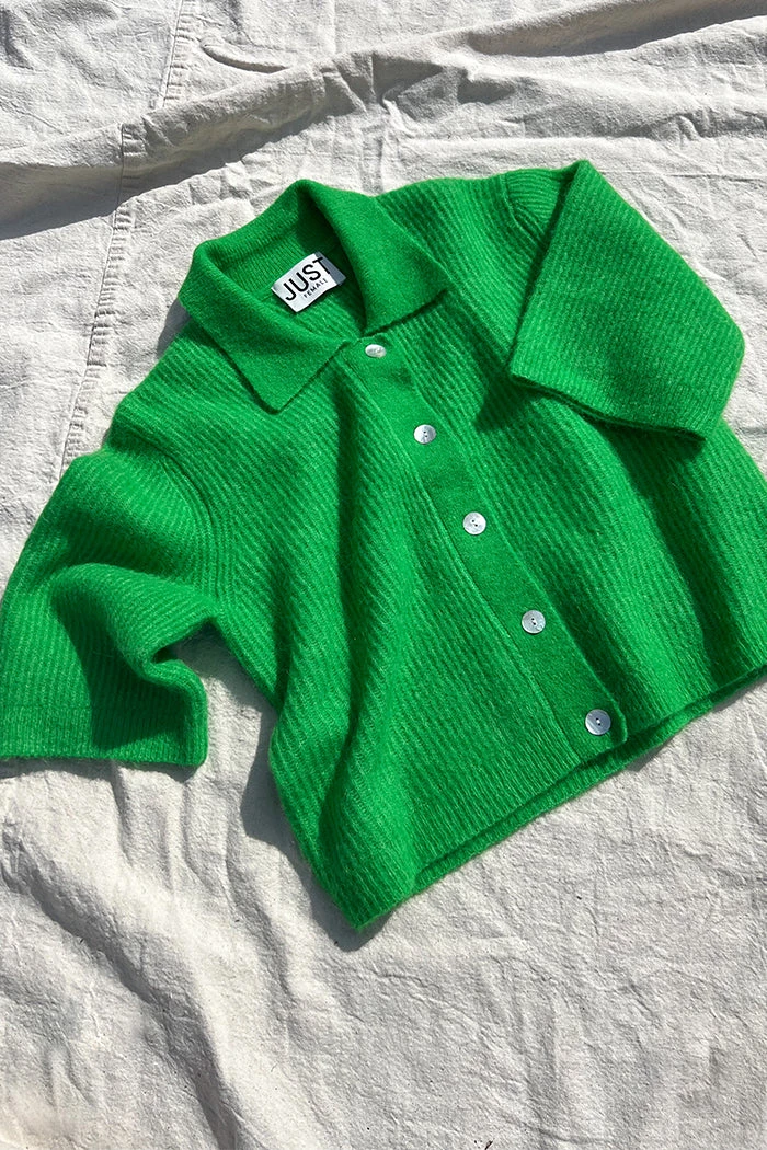Just Female Rebelo short sleeve cardigan sweater in vibrant fern green.