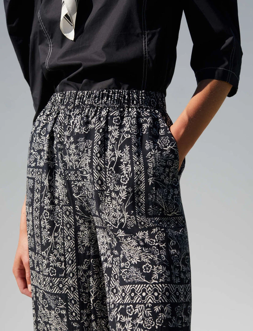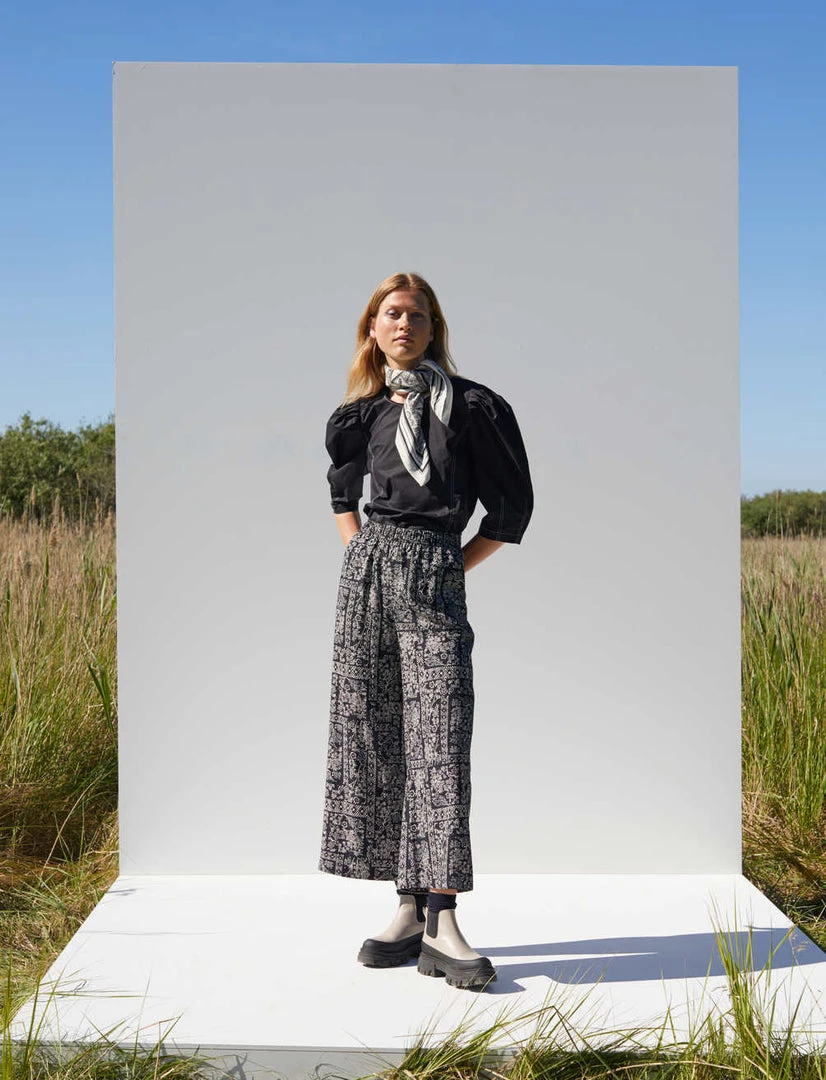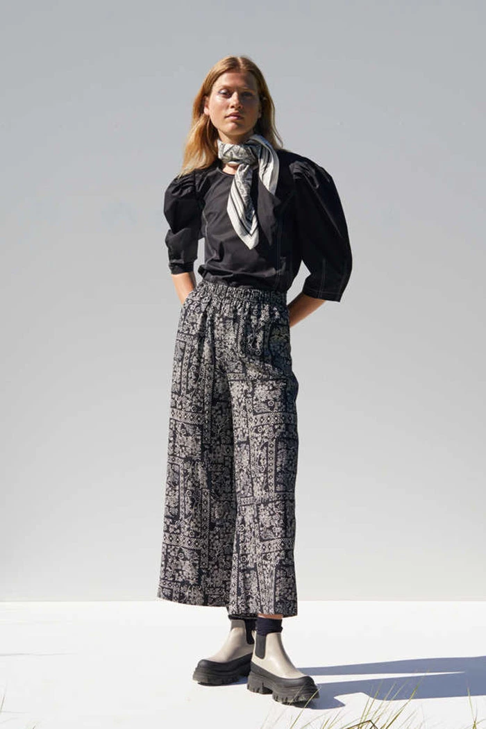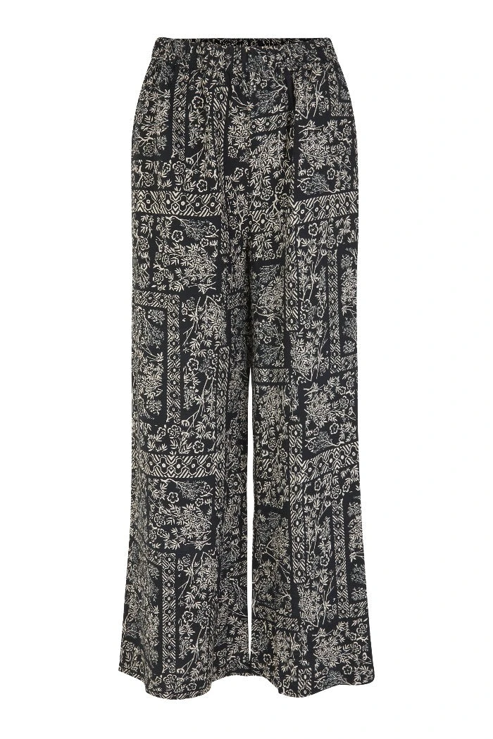 Just Female black paisley printed flowy Strong pants. Comfortable, high-waisted trousers with an elastic waist, straight legs, and side pockets.
