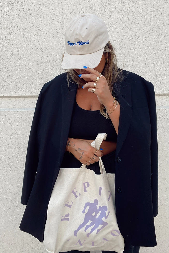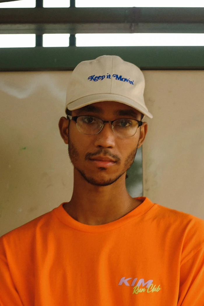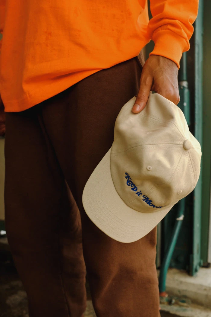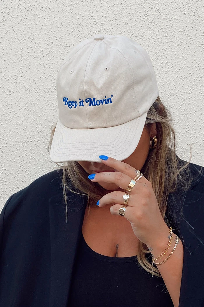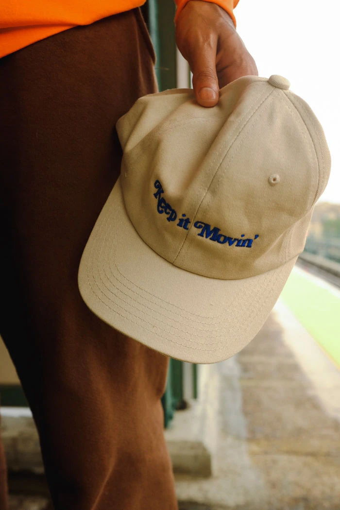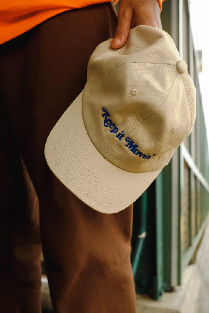Keep it Movin’ glyph royal blue embroidered on khaki hat.