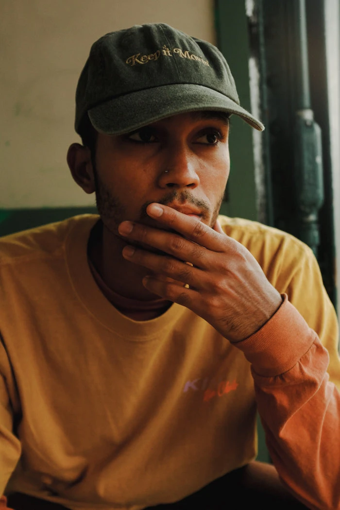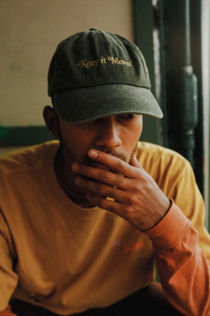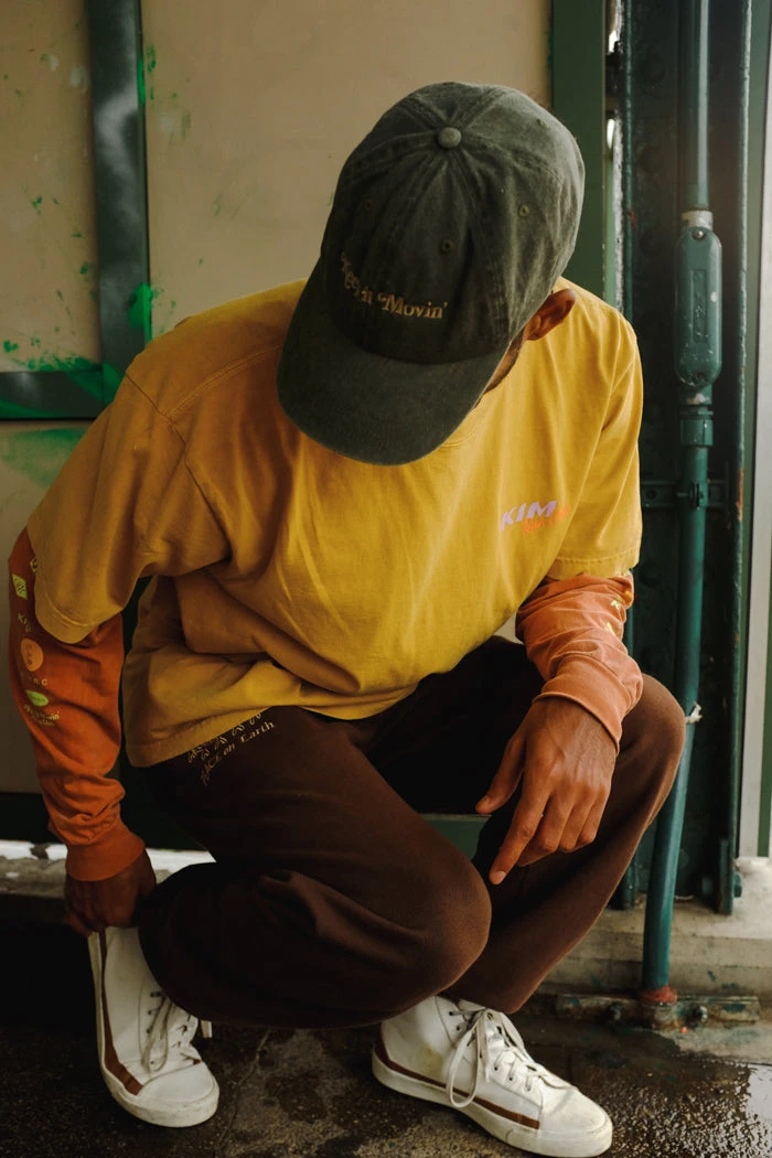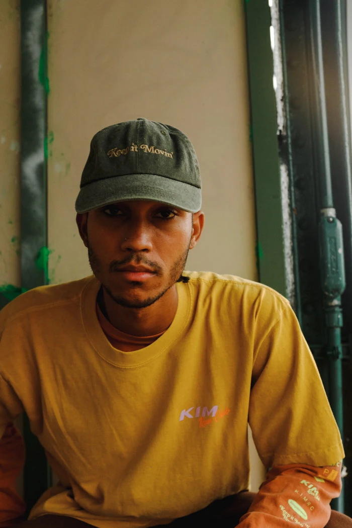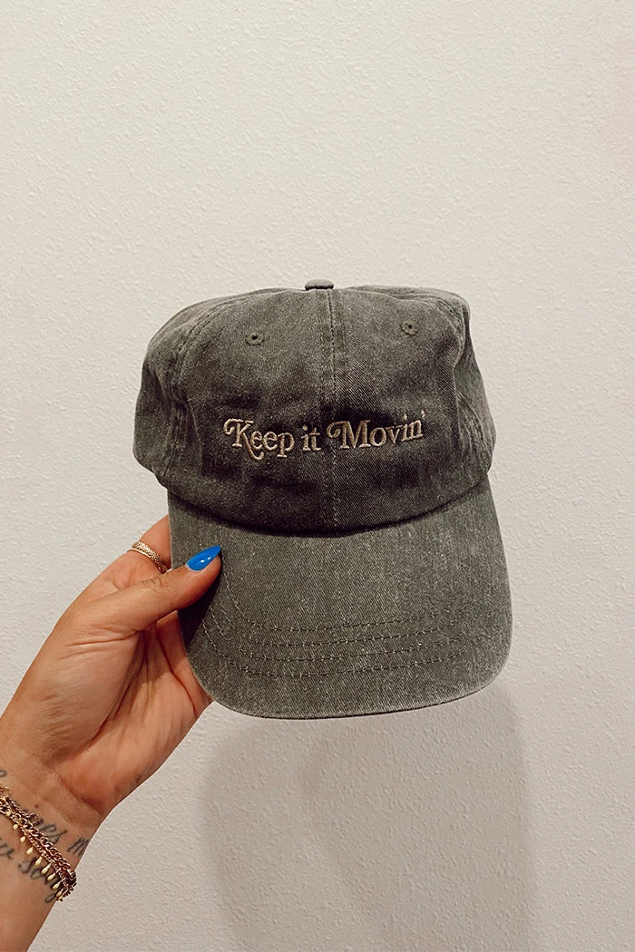 Keep it Movin’ glyph light green embroidered on faded denim hat.