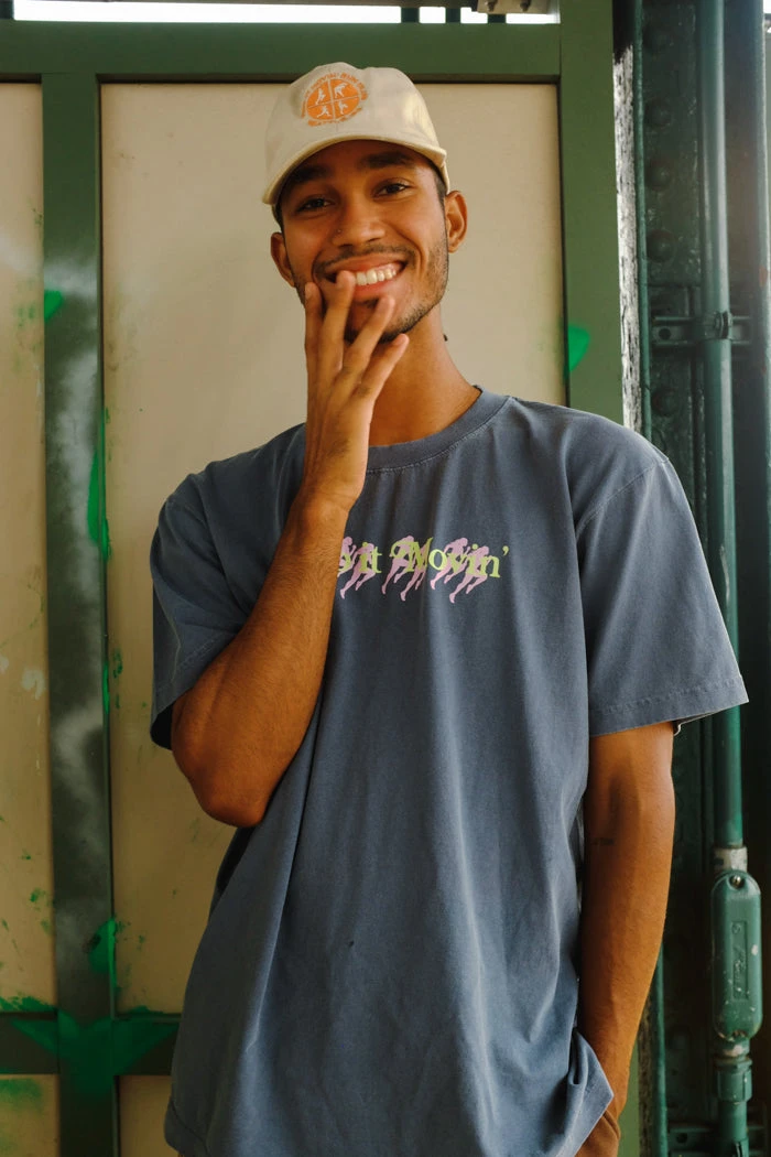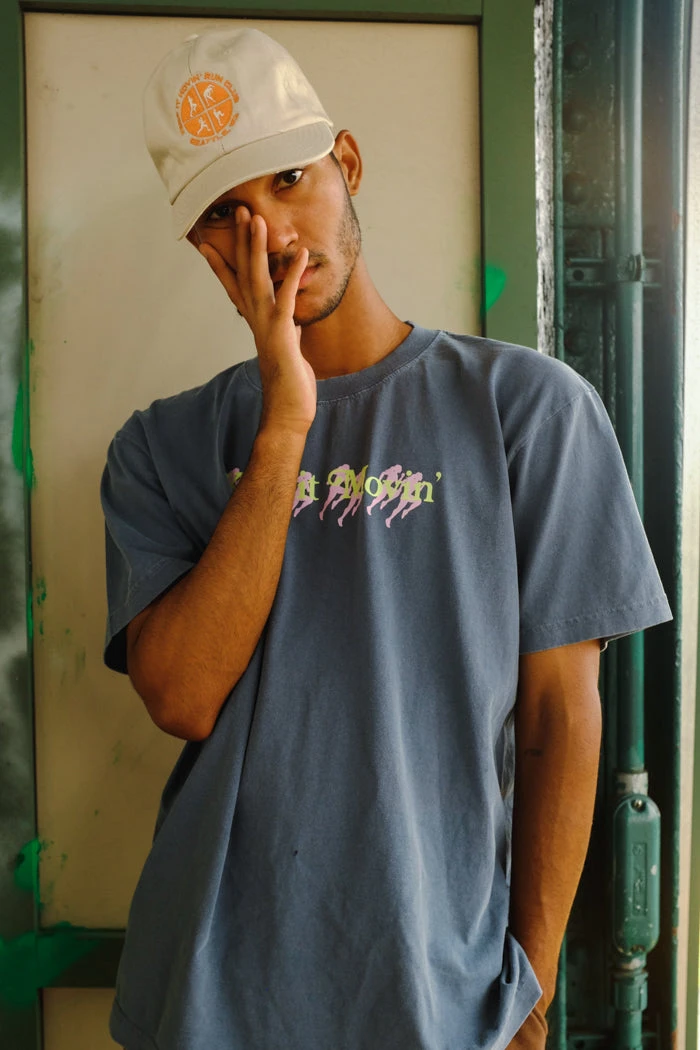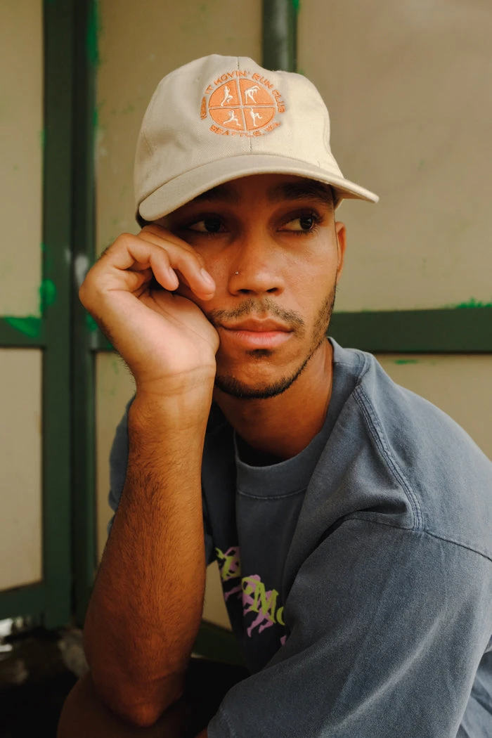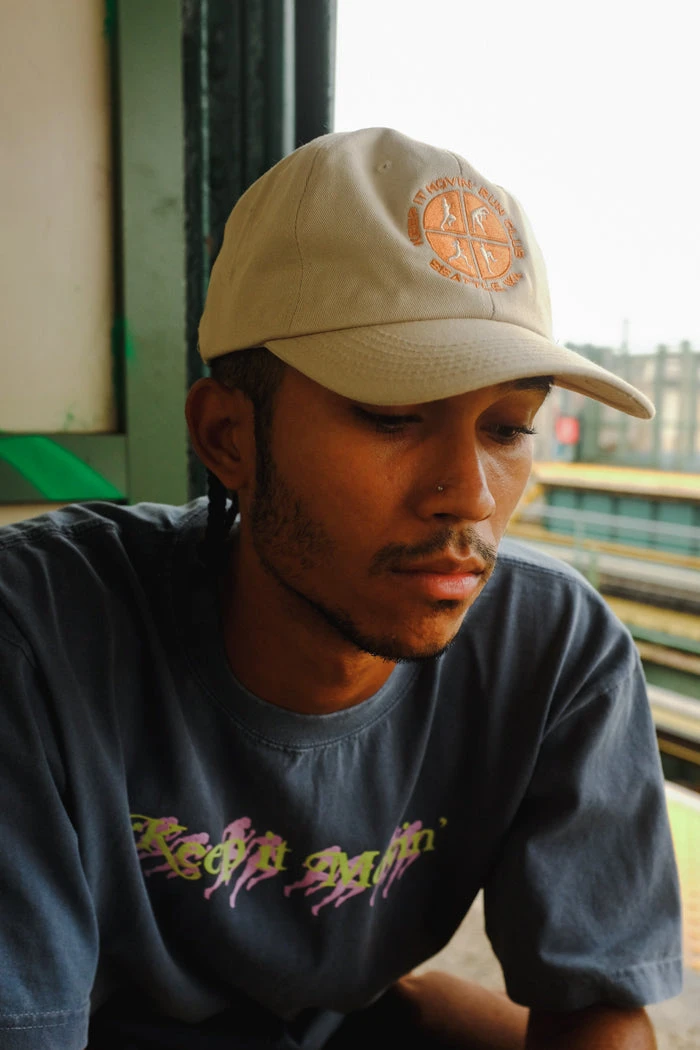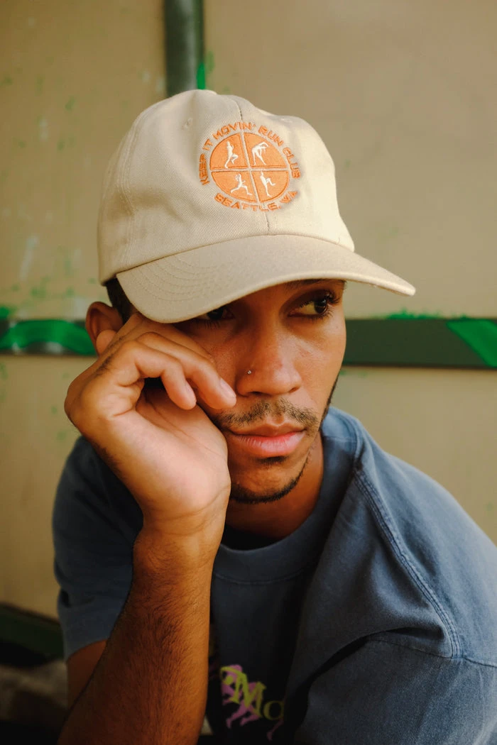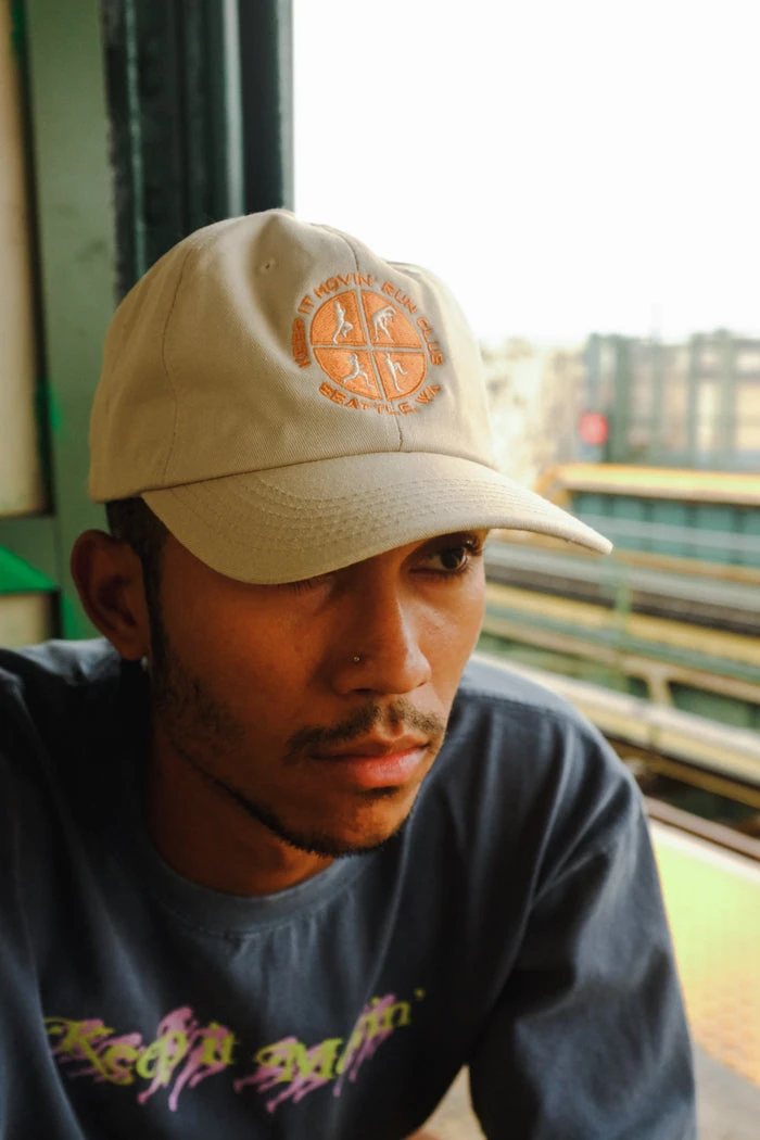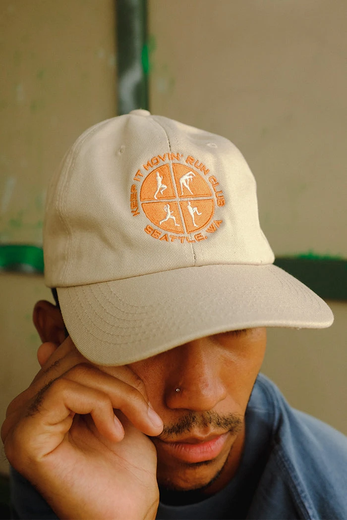 Keep it Movin’ runners Warm Up orange embroidered on khaki hat.