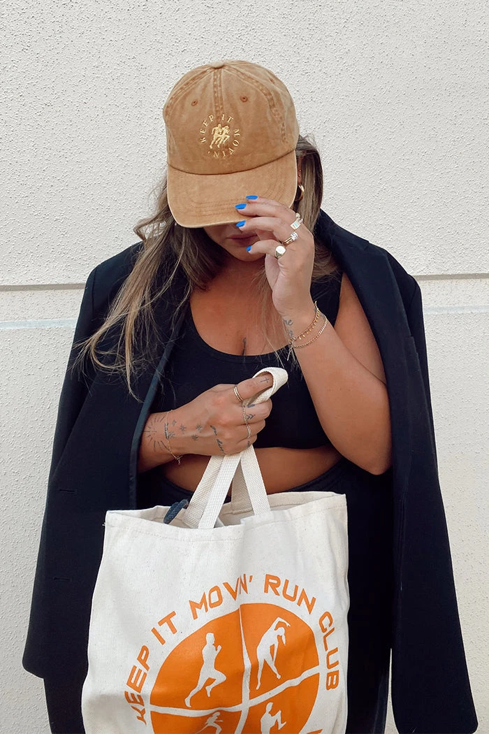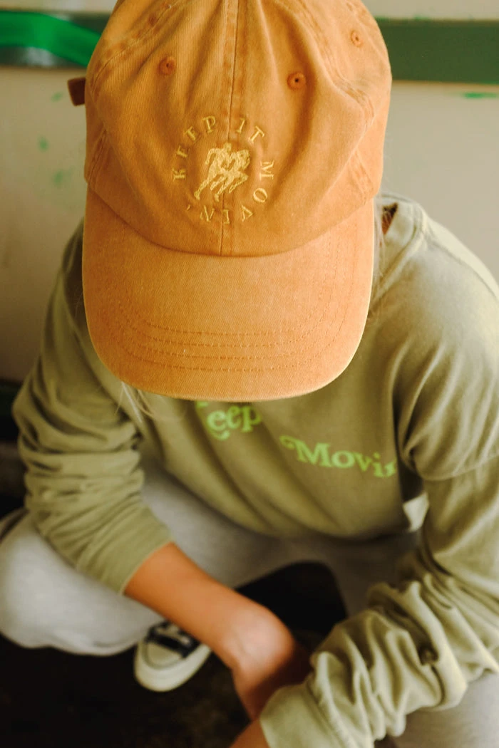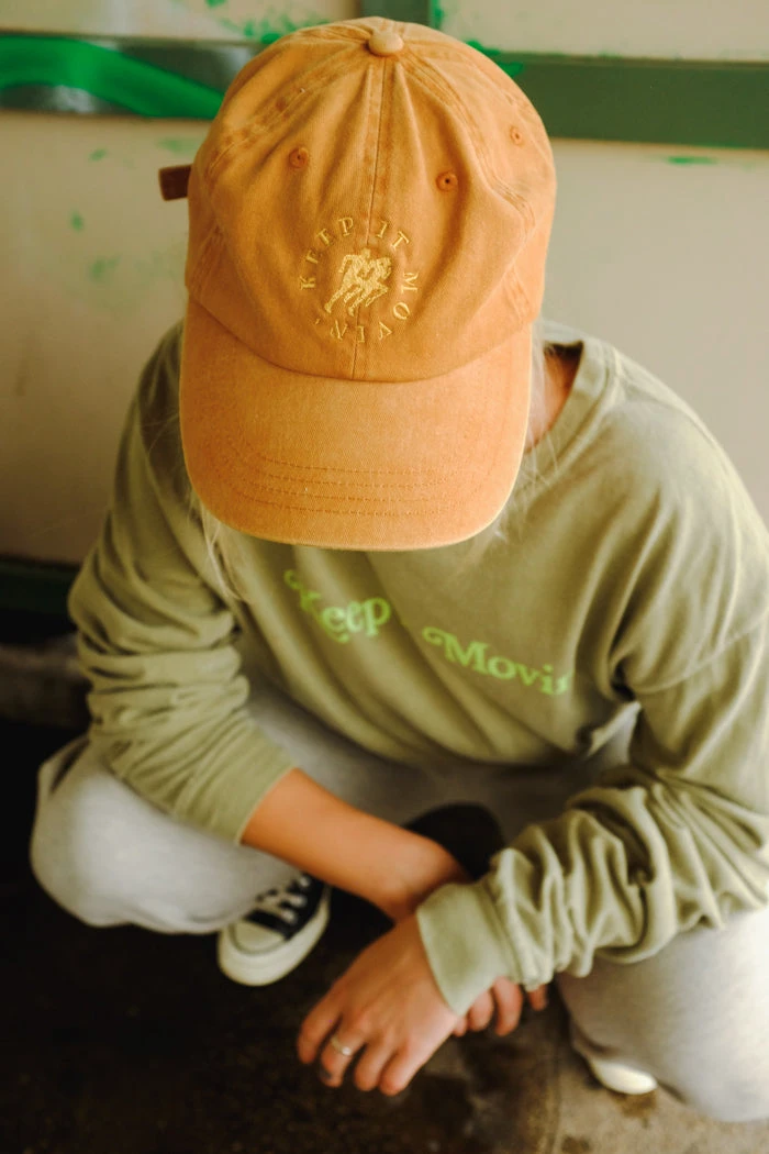 Keep it Movin’ runners Winners Circle mustard embroidery on washed orange hat.
